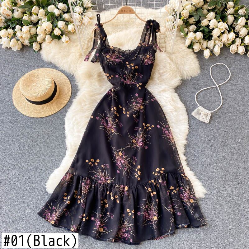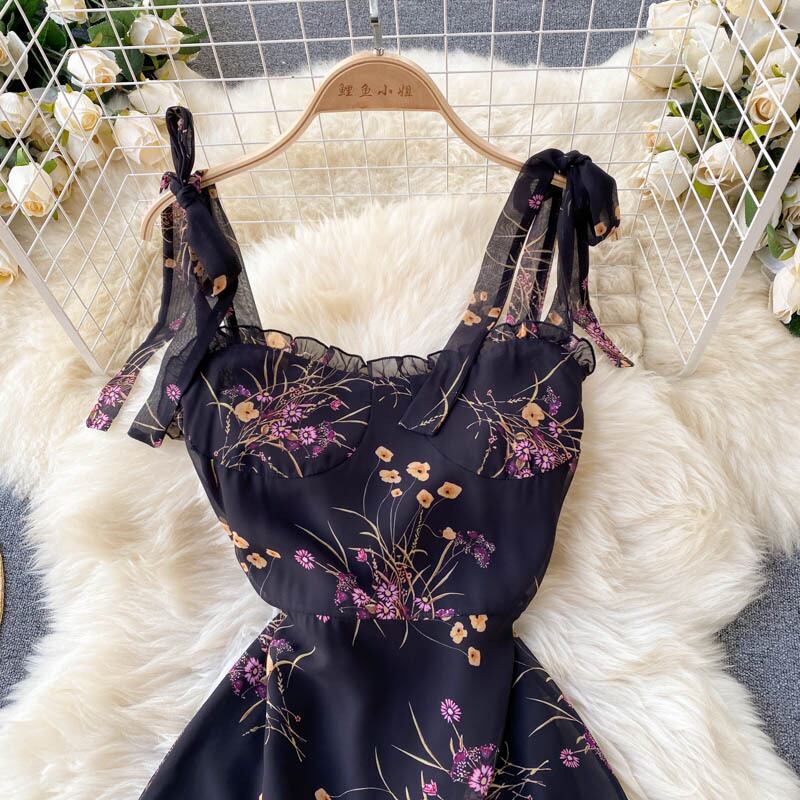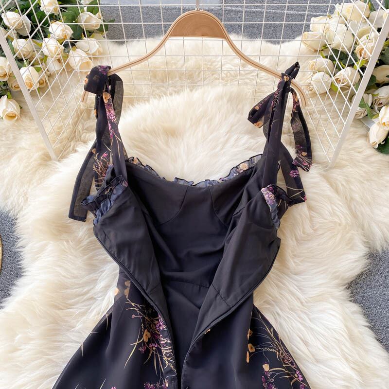 女性フレンチプリントストラップドレスセクシーなノースリーブフリルAラインシフォンドレス夏自由奔放に生きるバケーションビーチミディサンドレス ラッフル サマー 夏物