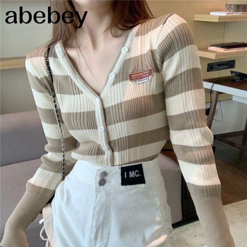 ストライプカーディガンレディースVネック長袖2021秋スリムニットセーターレター刺繡オールマッチ ロング 刺繍 オータム 秋物