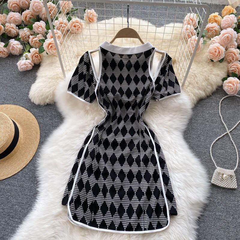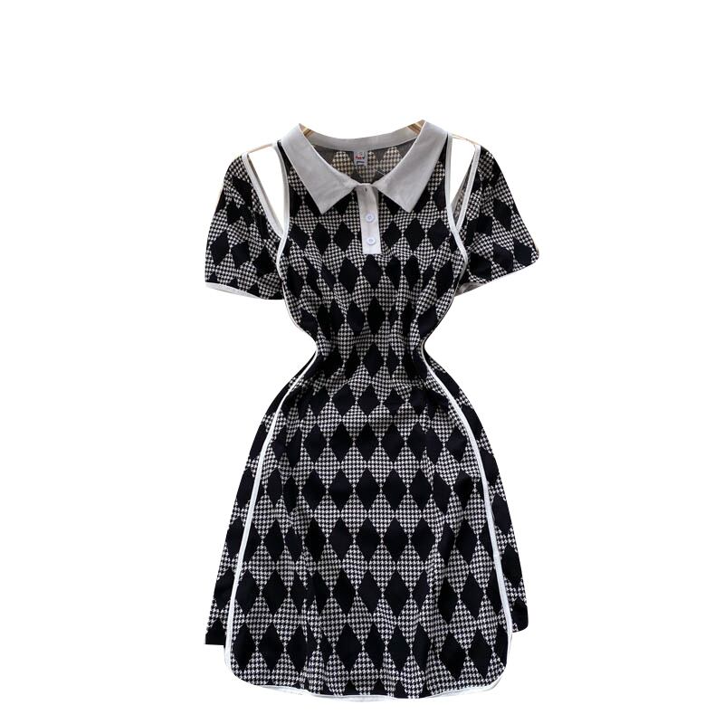 レトロなダイヤモンドチェック柄ドレス女性ターンダウン-襟半袖Aラインドレスサマーホローオフショルダーサンドレス ショート ハーフスリーブ 夏物