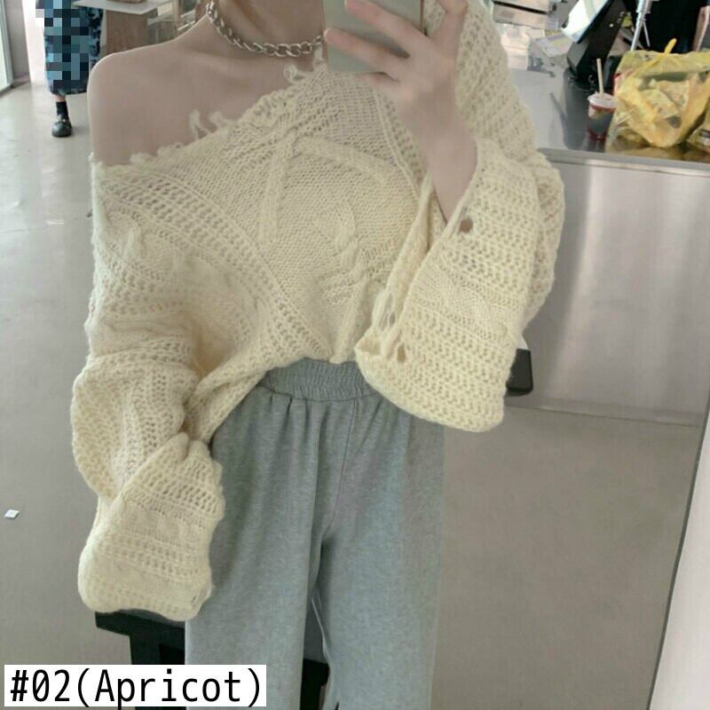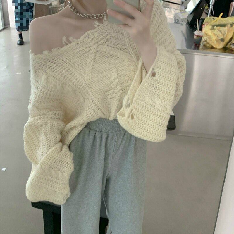 エズガガブロークンホールニットセータープルオーバー女性秋オフショルダーロングフレアスリーブオーバーサイズトップスセクシージャンパー オータム 秋物