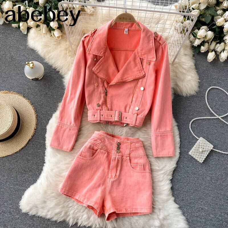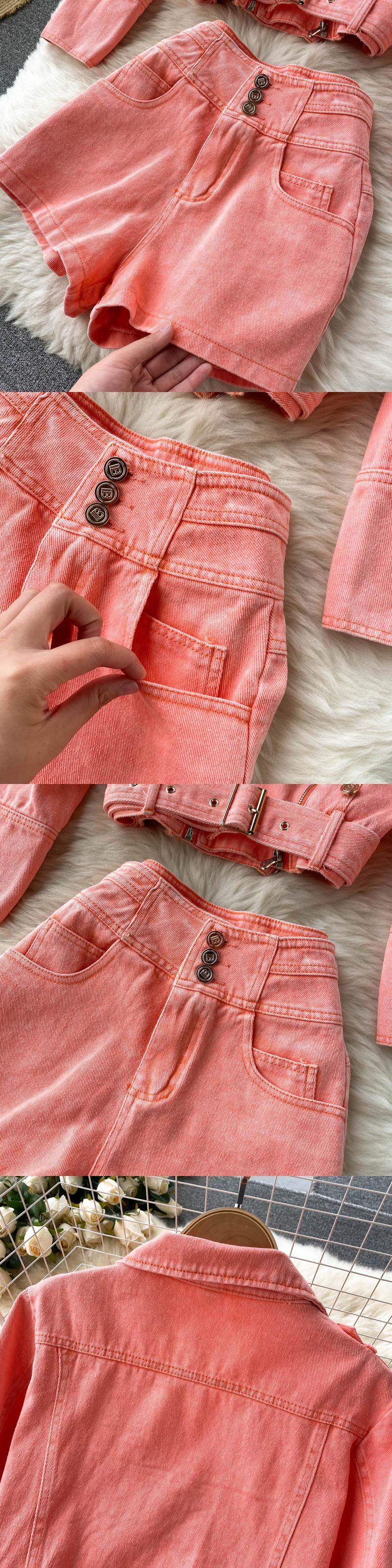 女性秋レトロデニムセット長袖ノッチカラーショートアウター+ウエストショーツツーピースセット ロング オータム 秋物 ブルマー