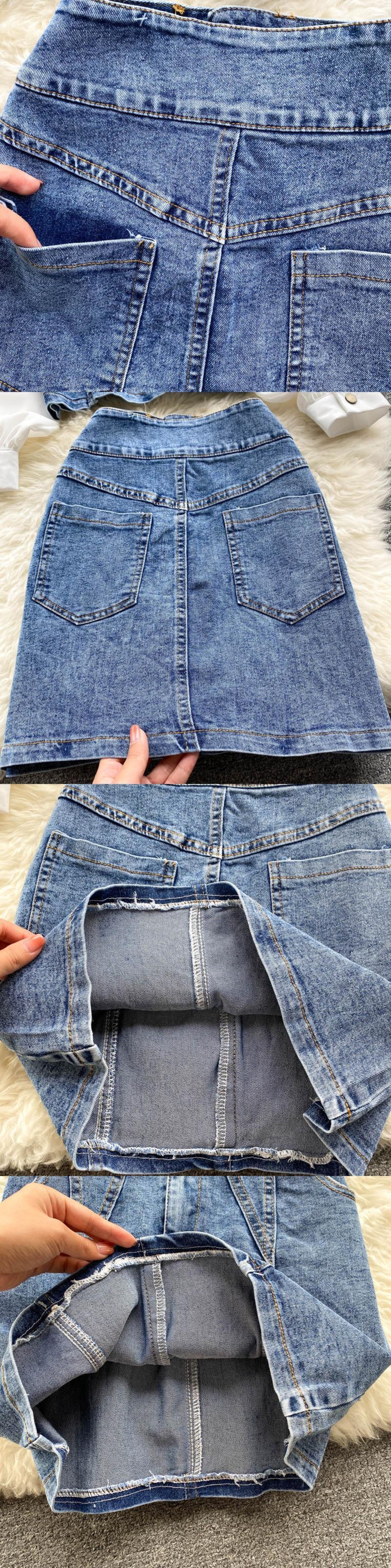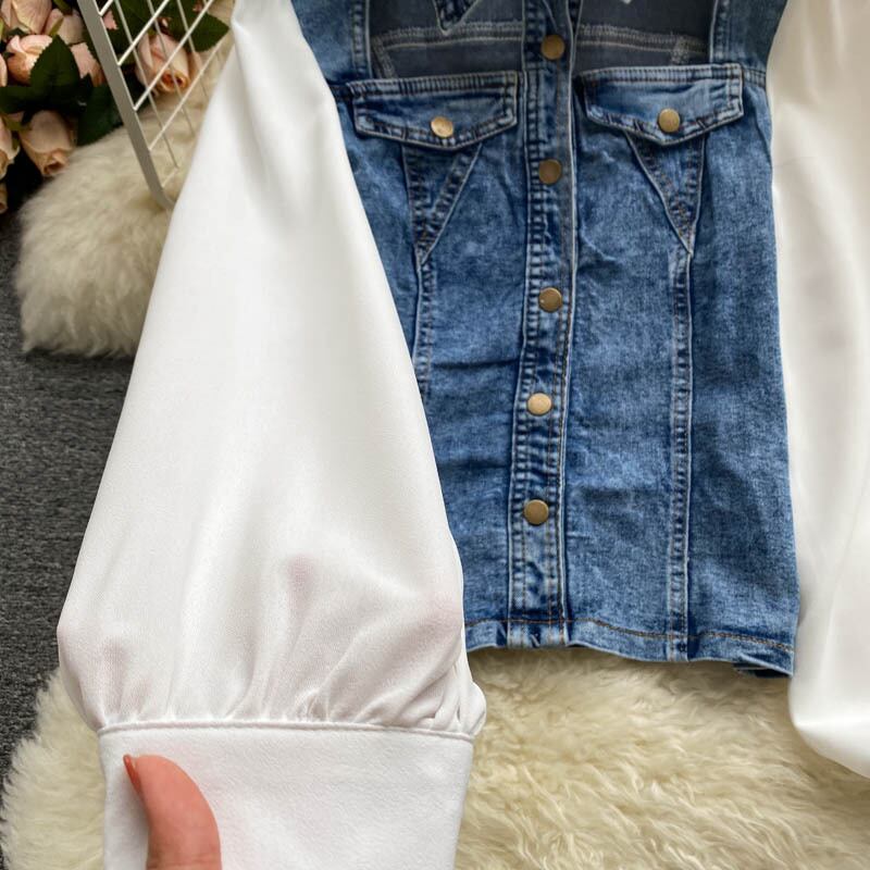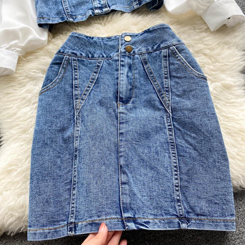 女性秋レトロデニムセット中空ターンダウン-襟長袖トップ+ウエストスリムショートスカートツーピーススーツ ロング オータム 秋物
