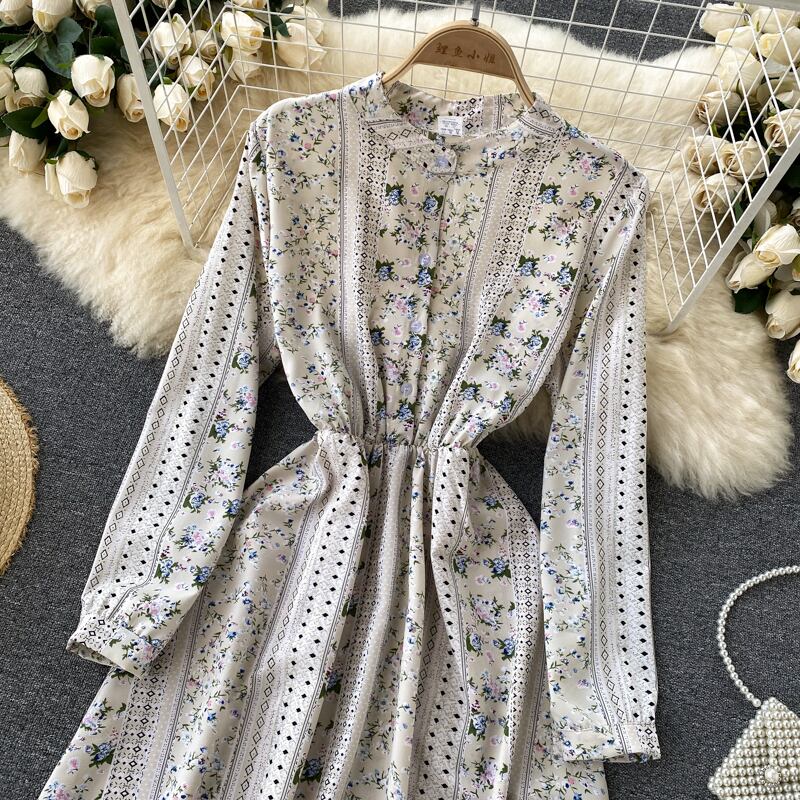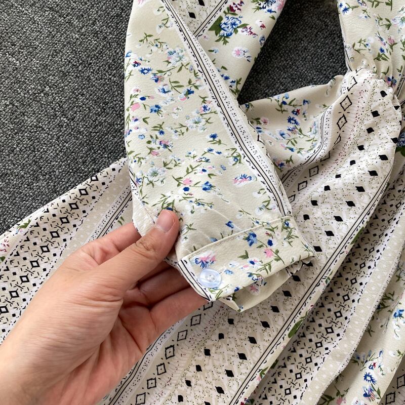 女性の甘い花柄ドレスフレンチ長袖OネックAラインドレス秋のボヘミアンプリントバケーションミディドレス ロング 大人ガーリー スウィート キュート カジュアル オータム 秋物