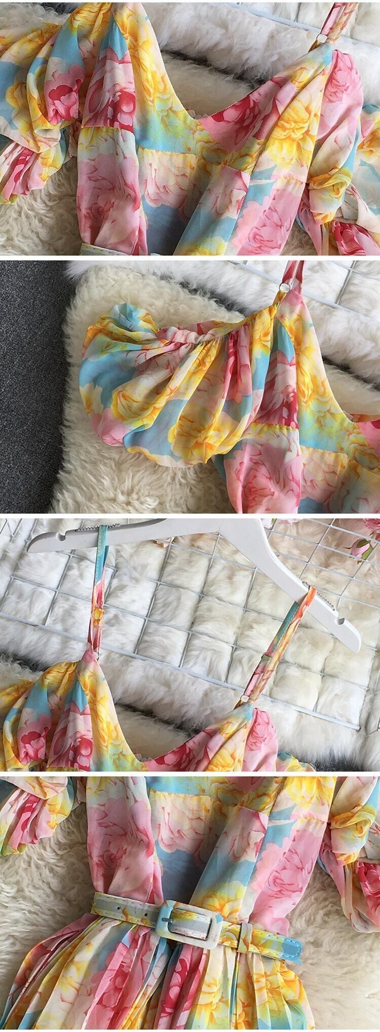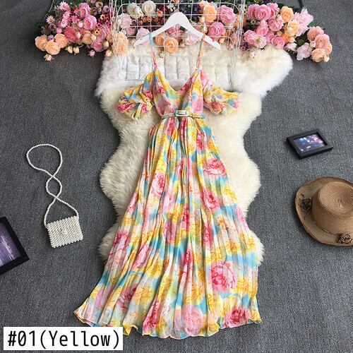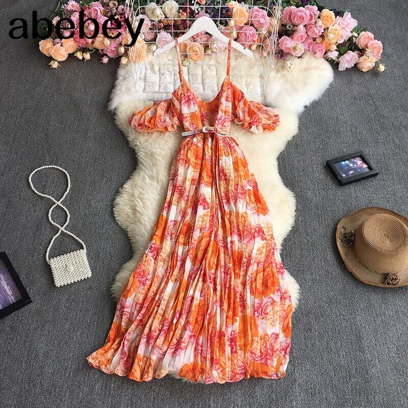 2021年夏のVネックオフショルダー半袖ドレスハイウエストレースアッププリントロングAラインストラッププリーツドレス ハイウェスト ショート ハーフスリーブ サマー 夏物