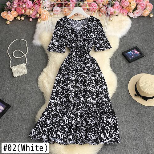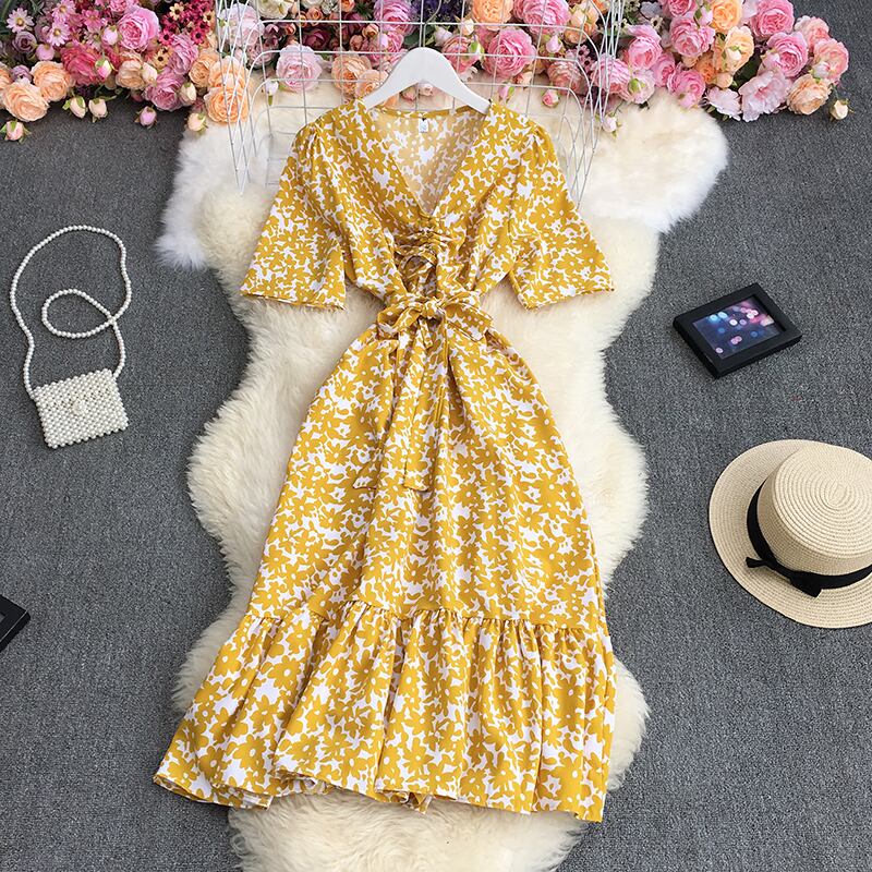 2021年夏の女性Vネック半袖ドレスフリルパッチワークハイウエストプリーツプリントミドル丈Aラインドレス ハイウェスト ショート ハーフスリーブ ラッフル サマー 夏物