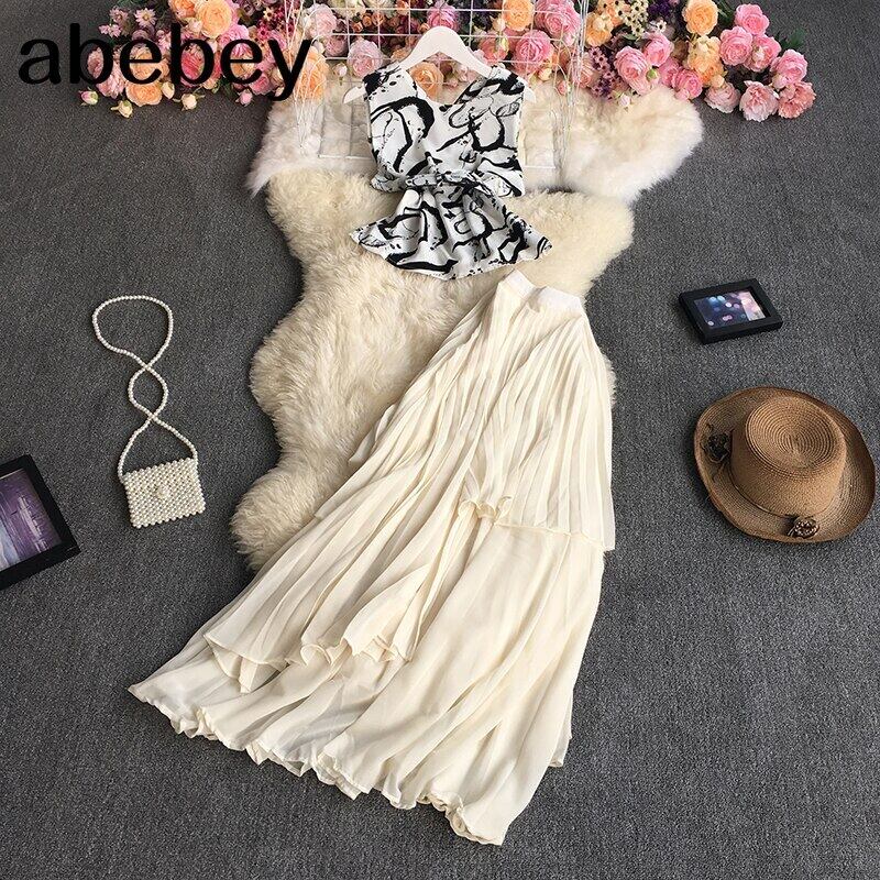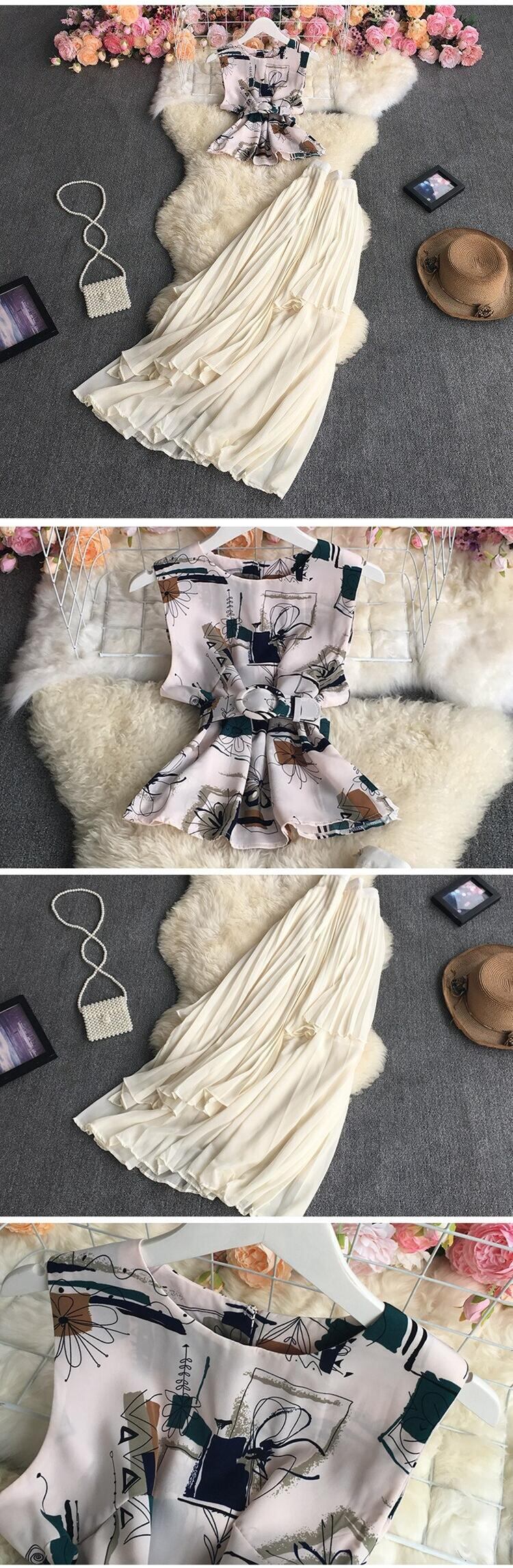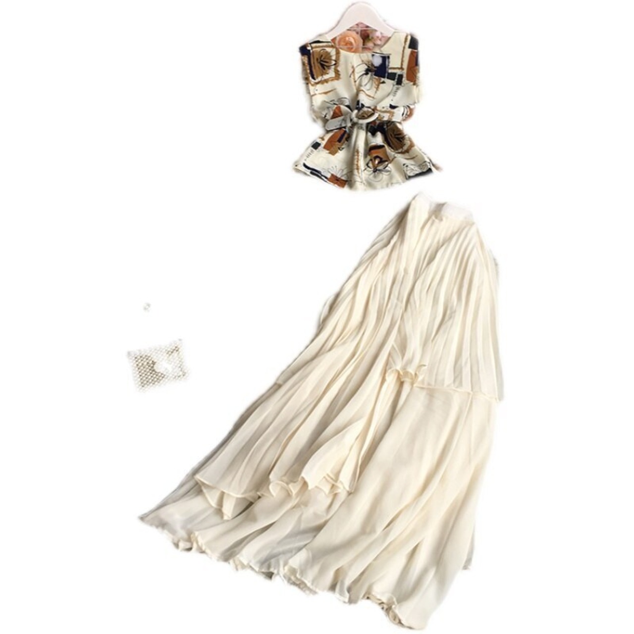 2021年夏のOネックノースリーブショートプリントレースアップトップス+ハイウエストミドル丈プリーツスカートツーピースセット ハイウェスト サマー 夏物