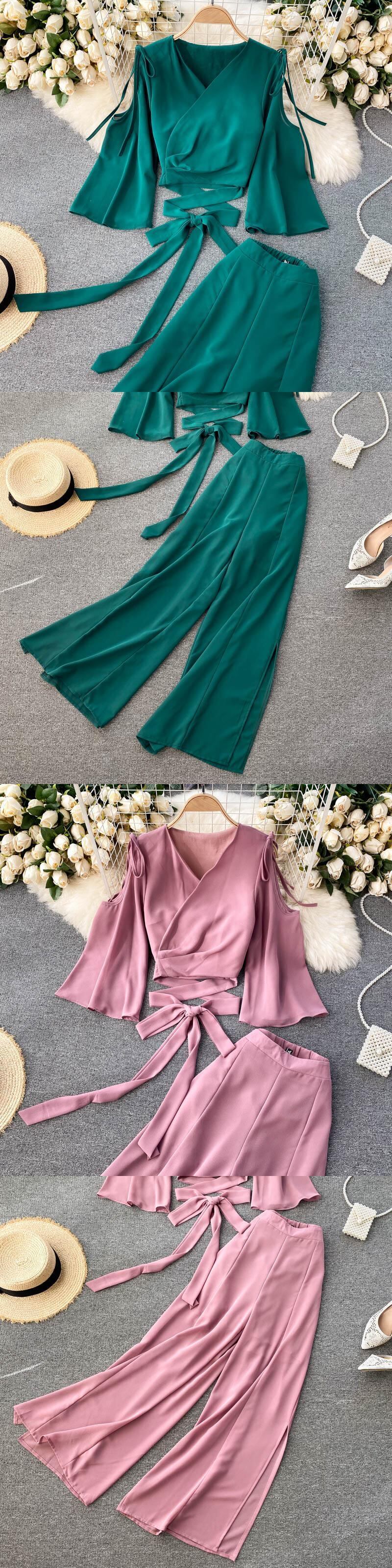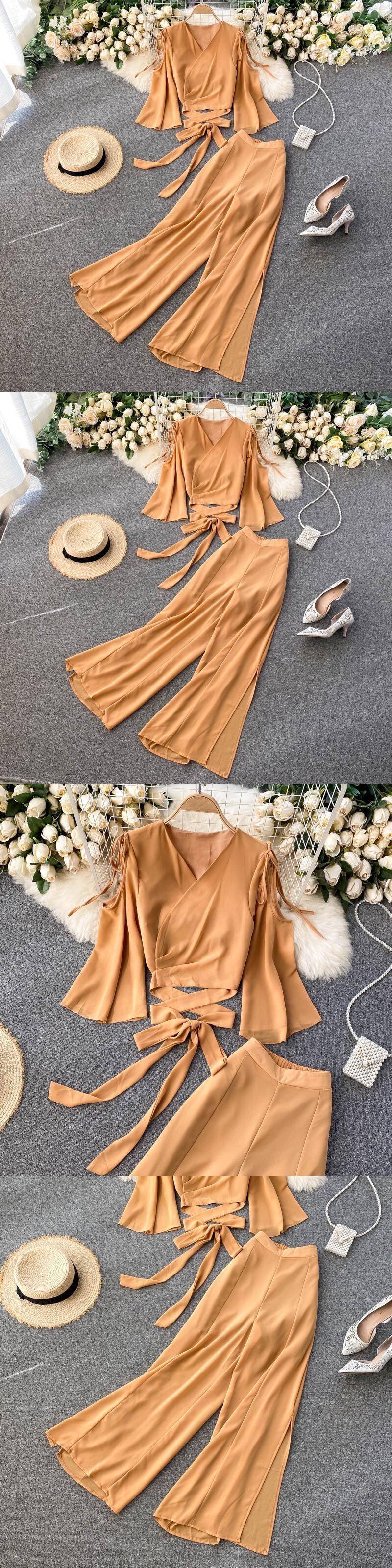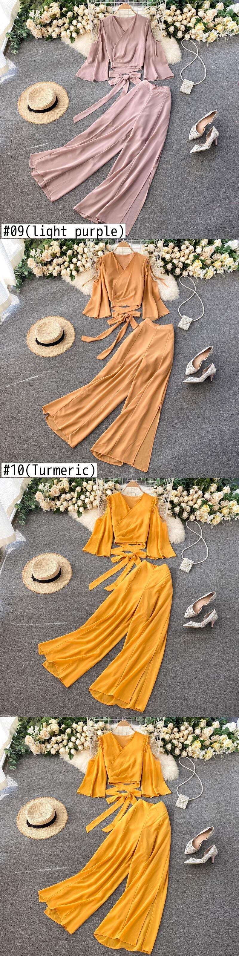 女性秋フレンチソリッドホリデーセットオフショルダーVネックショートトップス+セクシースプリットウエストパンツ2点セット オータム 秋物 ソリッドカラー