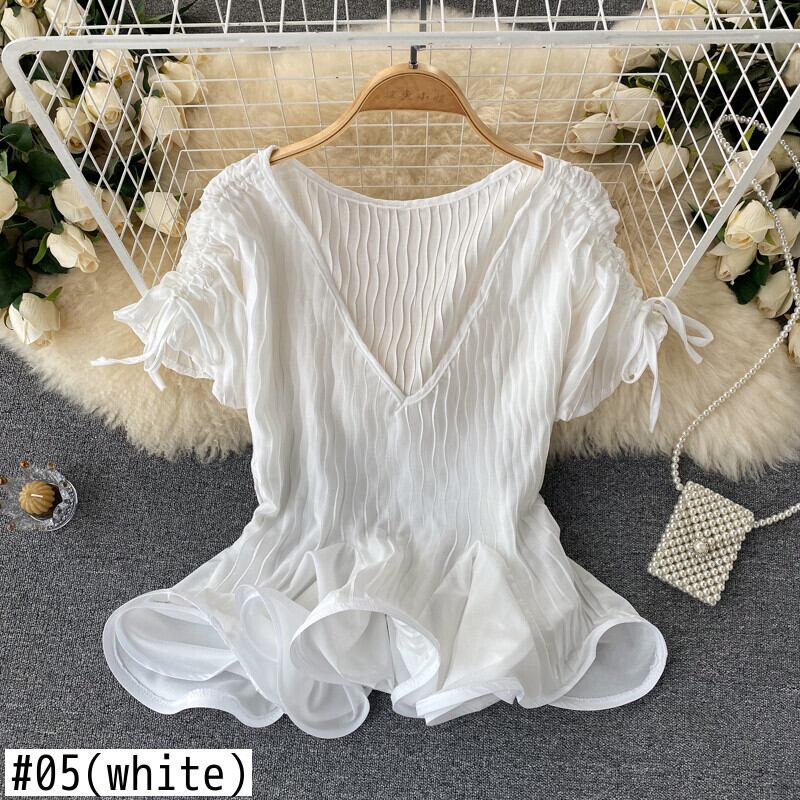 レディースブラウス半袖Vネックソリッドフリルトップス2021サマーストリートウェアブラウス ショート ハーフスリーブ ラッフル 夏物 ソリッドカラー