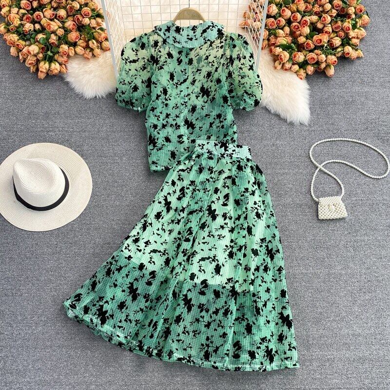 女性サマープリントバケーションセットパフスリーブシングルブレストトップス+ウエストAラインロングスカートツーピーススーツ 夏物