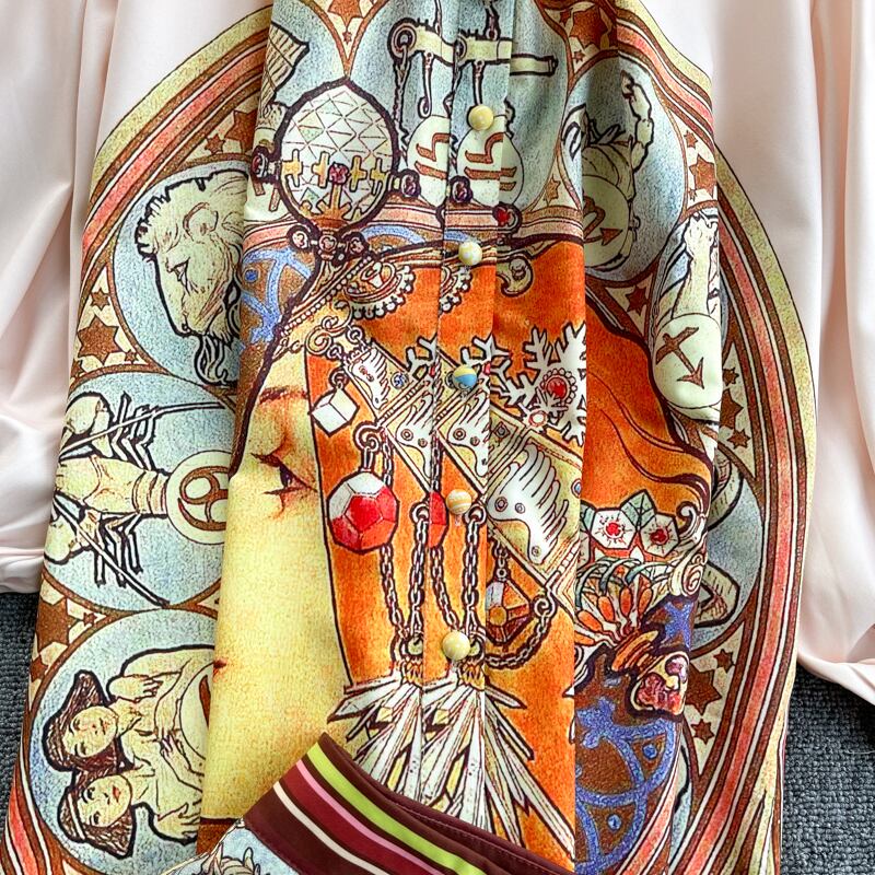 女性春レトロプリントスーツランタンスリーブボタンルーズトップス+ウエストワイドレッグショートパンツツーピースセット スプリング 春物 ワイドパンツ