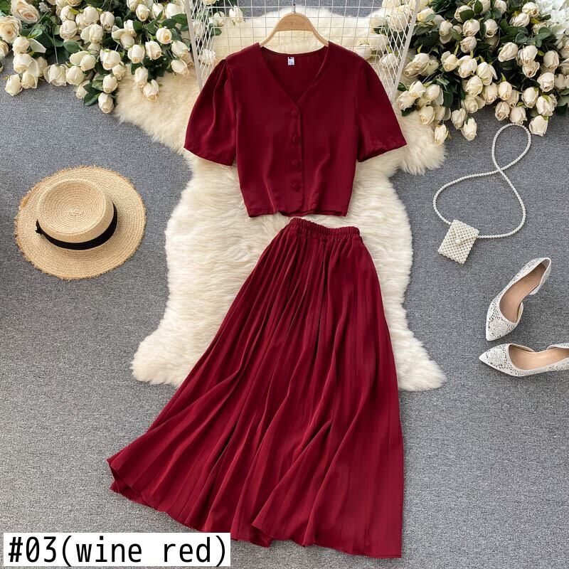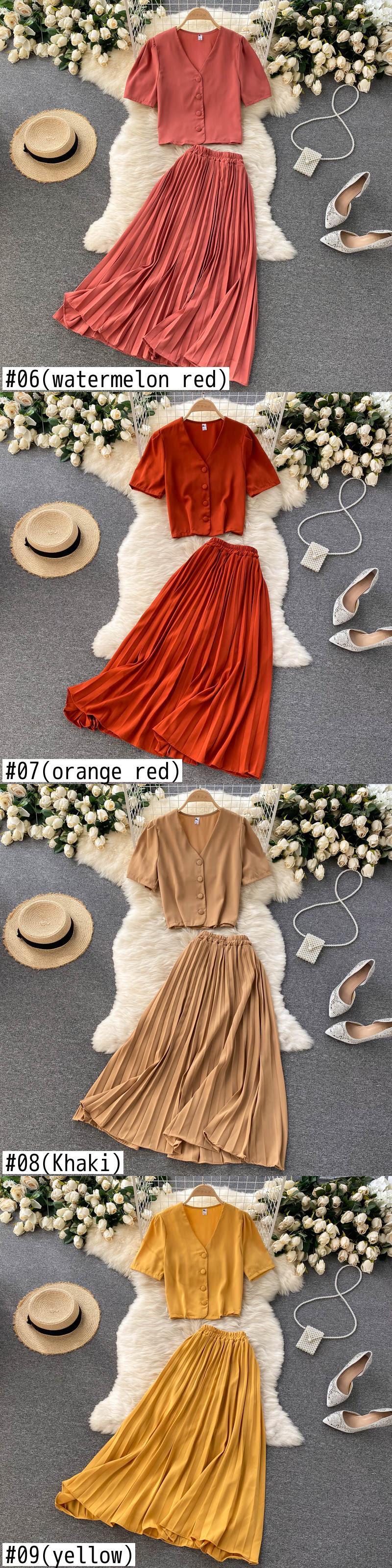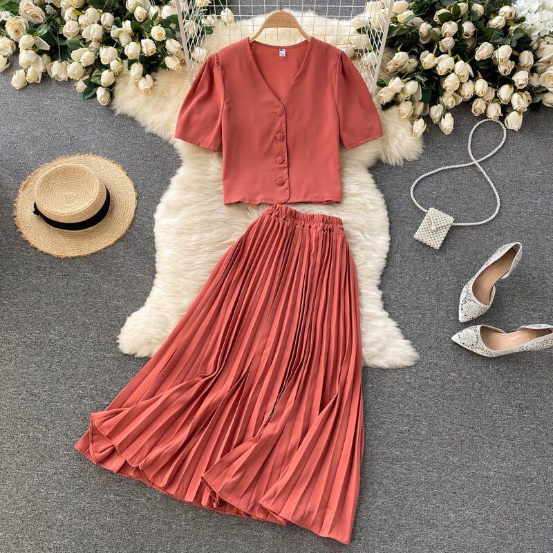 女性サマーストリートウェアセットショートVネックシングルブレストショートトップス+ウエストプリーツロングスカートツーピースセット 夏物