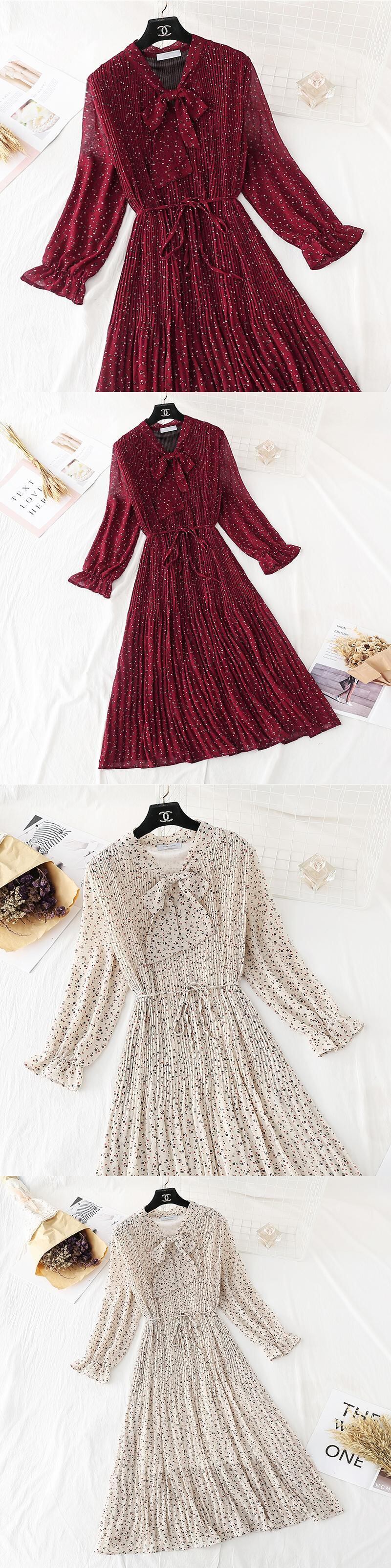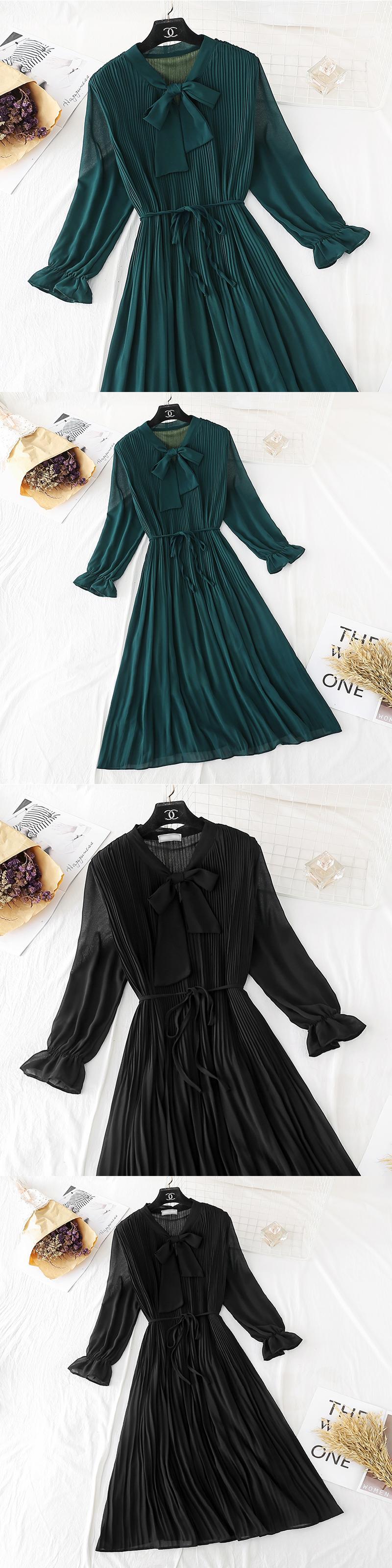 2021年春秋フレアスリーブレースアップボウネックベーシックドレス リボン スプリング 春物 オータム 秋物