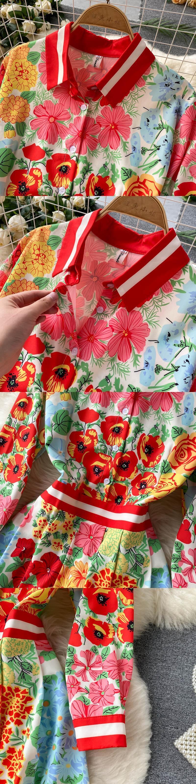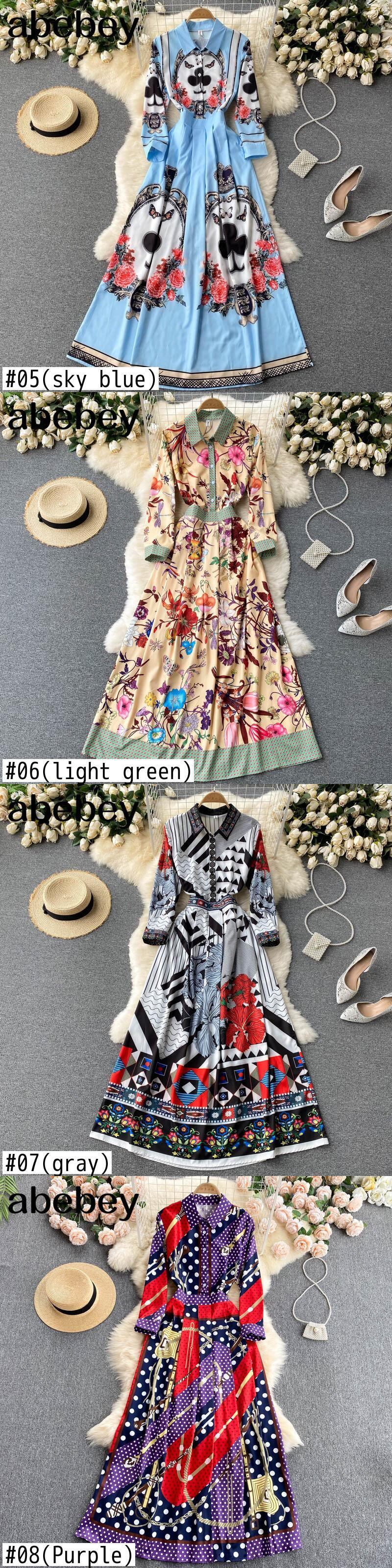 女性プリントマキシドレスターンダウン-襟長袖Aラインドレス夏休みロングドレス サマー 夏物