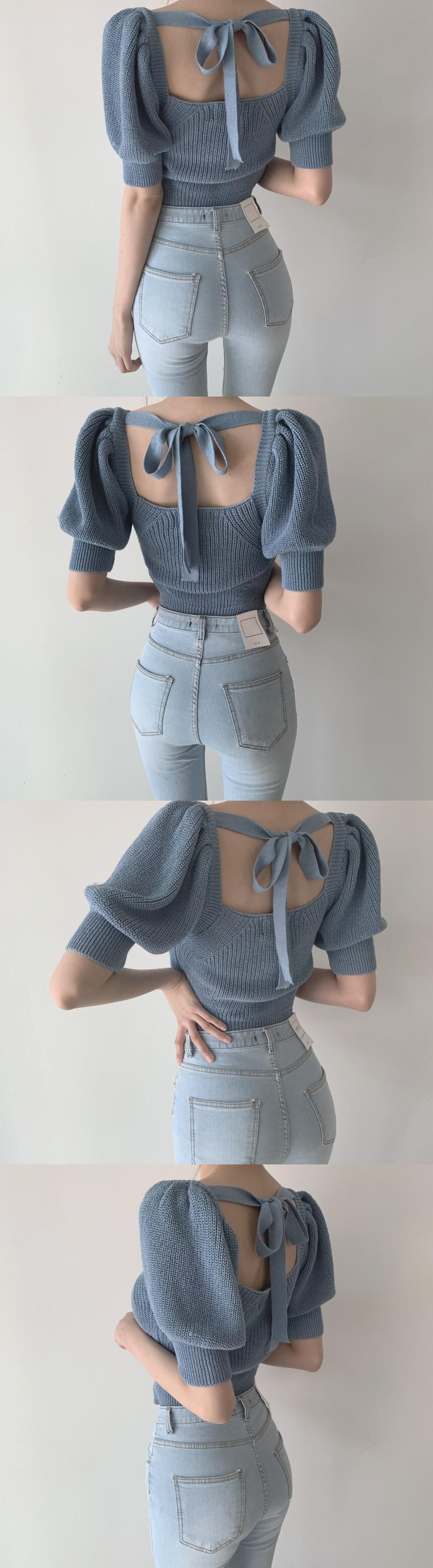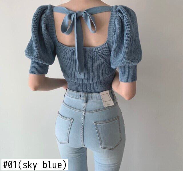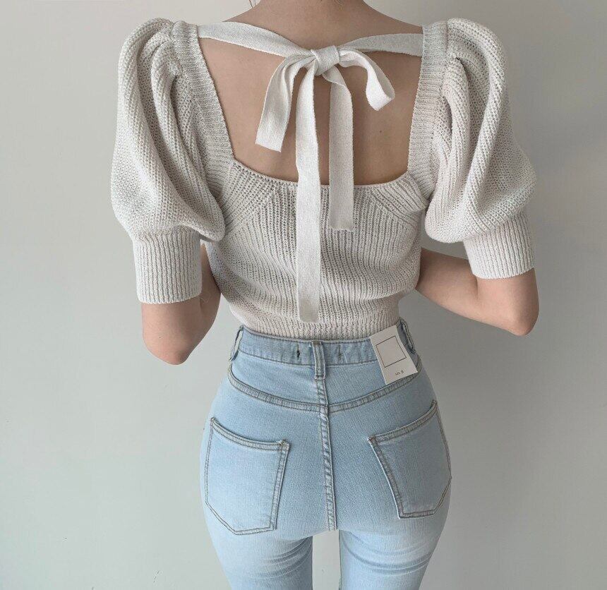 シックな背中の開いたニットプルオーバー女性はシックなスクエアカラーの中空セーターパフスリーブトップス2022をひもで締めます レース レースアップ スクウェア Rhc60419040023