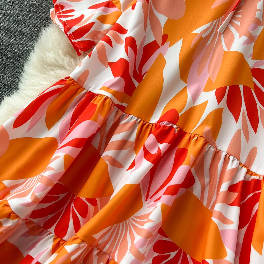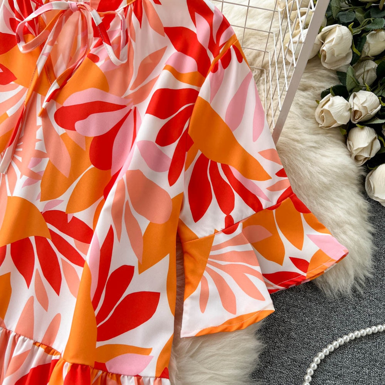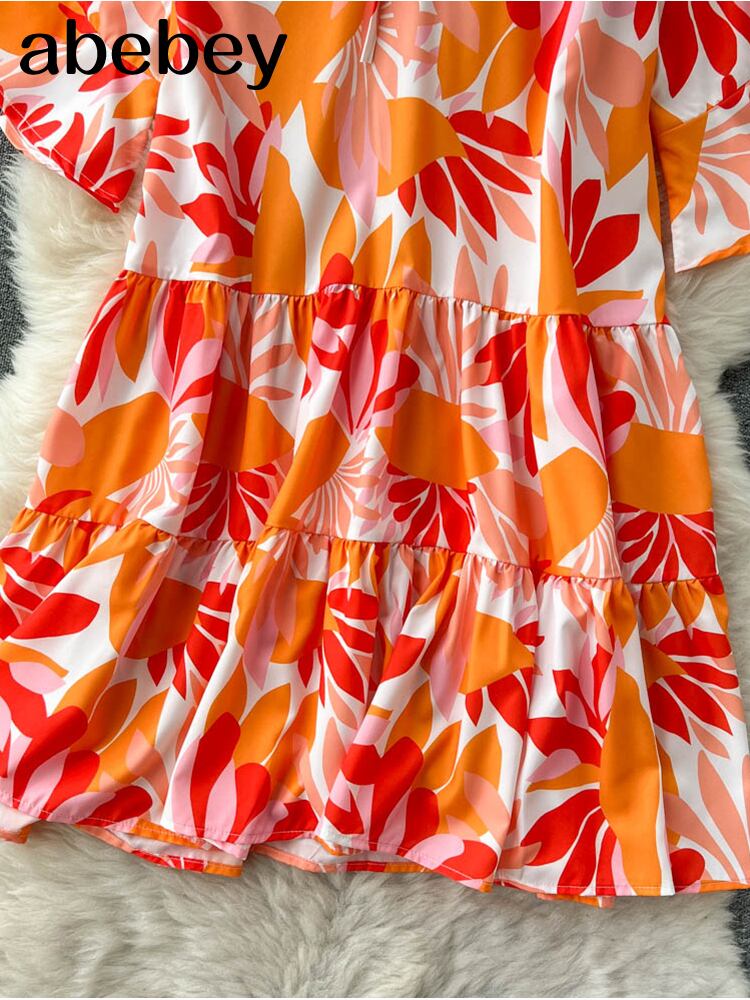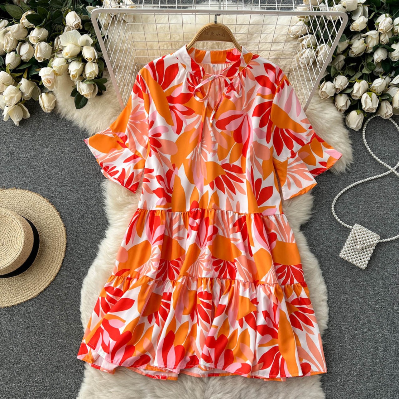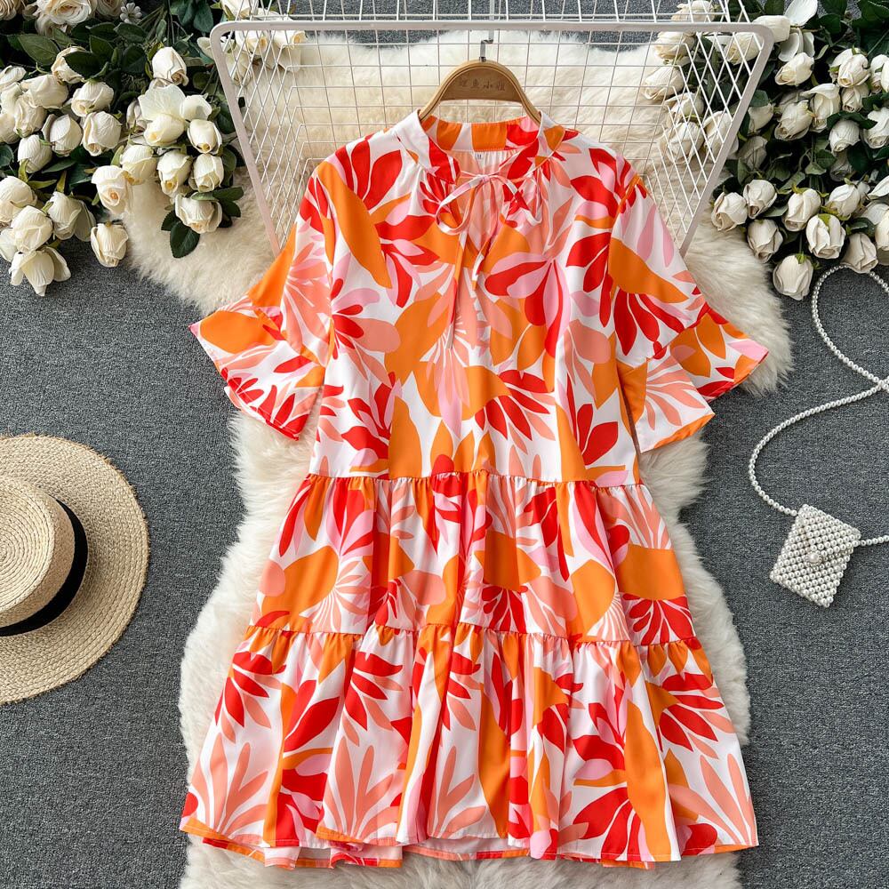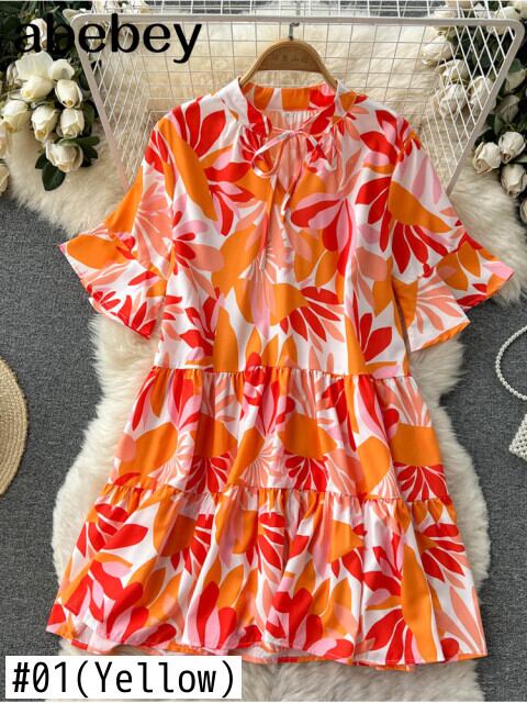 夏のフレンチスタイルの女性のドレス2022半袖バケーションボウフロールスリムビーチAラインミディプリントドレス ショート リボン ハーフスリーブ サマー 夏物 Abe38888865772