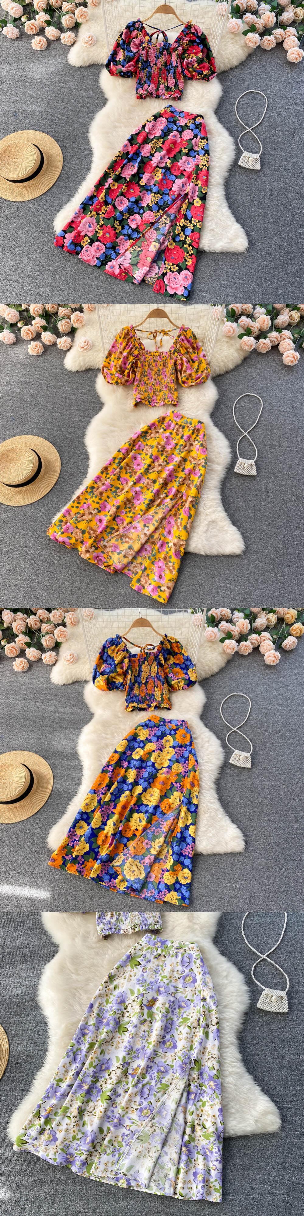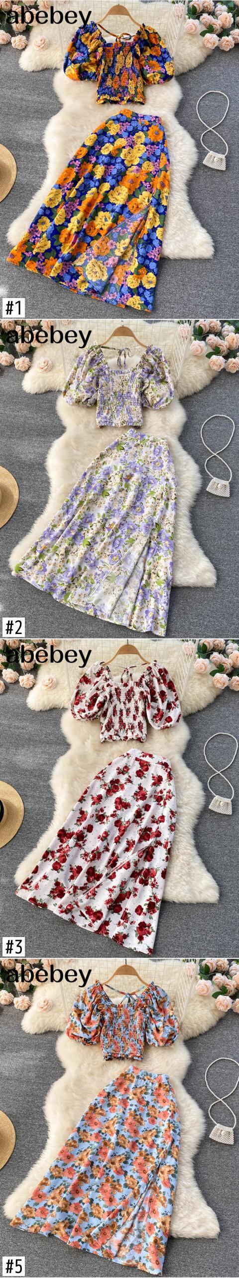 2022セクシープリントビーチレディーススーツスクエアネックランタンスリーブホローアウトクロップトップウエストスカートツーピースセット スクウェア Abe71380360084