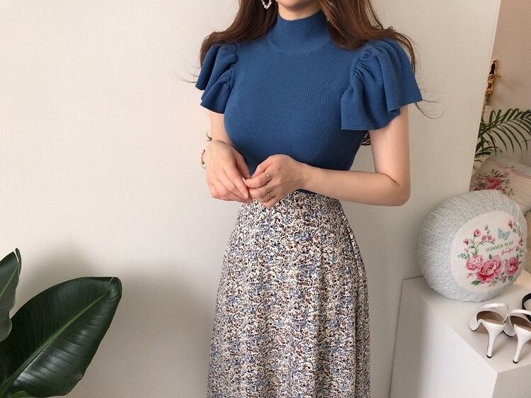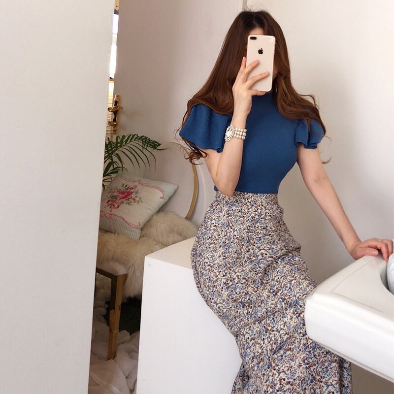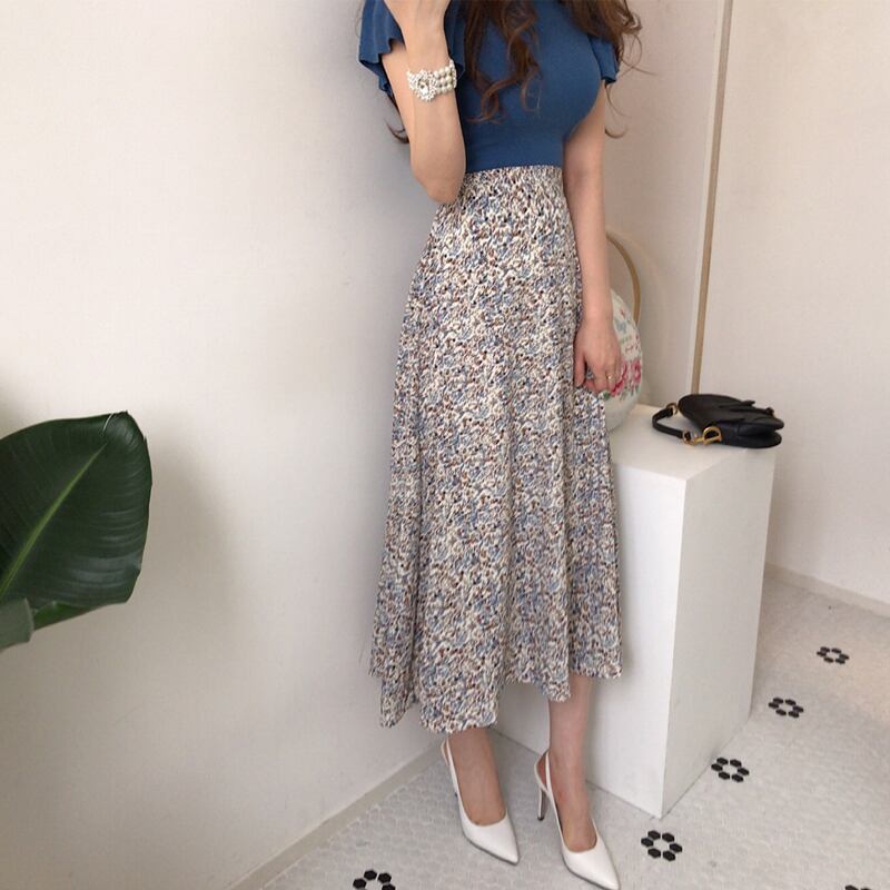 2022年夏の女性2ピーススカートセット衣装ブルートップス+プリントエラスティックウエストAラインスカートヴィンテージマッチングセット 伸縮 サマー 夏物 ビンテージ Rhc98979097193