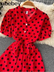 夏の女性レッドポルカドットドレス2022ヴィンテージウエストAラインVestidosVeranoVネックミディロングドレス サマー 夏物 ビンテージ Abe91231995473
