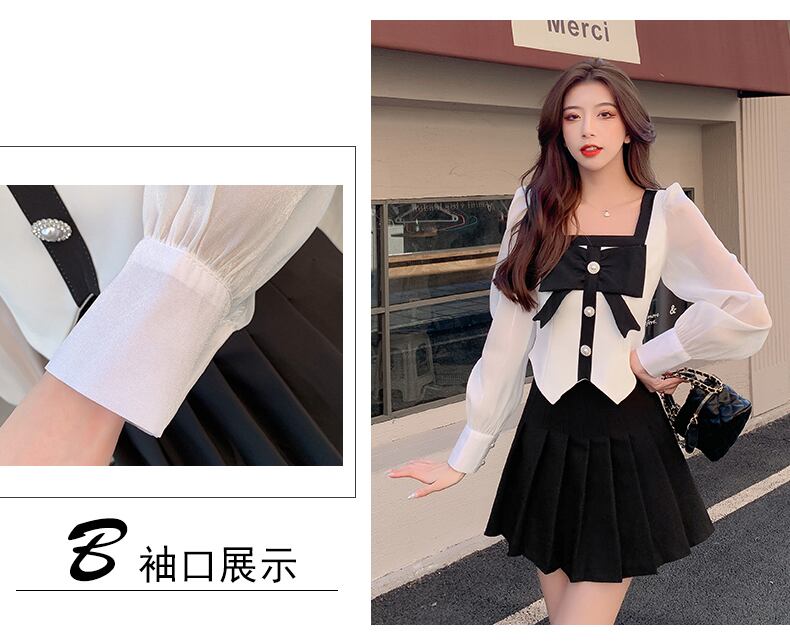 2022年女性サマースウィートキュートボウスクエアネックトップ+プリーツミニスカートスーツ2点セット衣装 リボン 大人ガーリー カジュアル 夏物 スクウェア Rhc67823277075