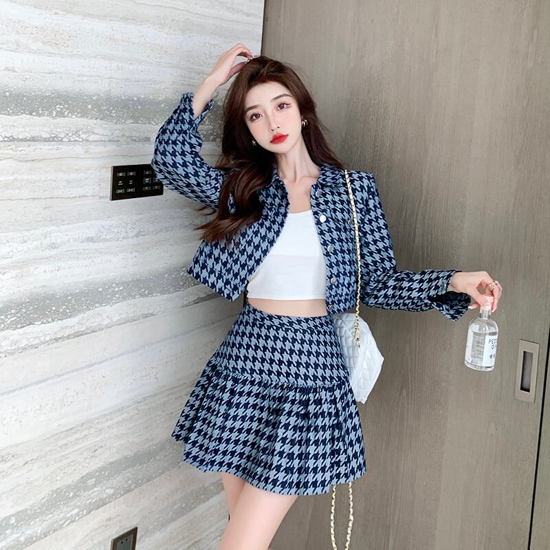 女性2ピーススカートセットスタイリッシュな千鳥格子デニムジャケットコート&ウエストスリムミニAラインスカート2022春 スプリング 春物 Rhc26049422574
