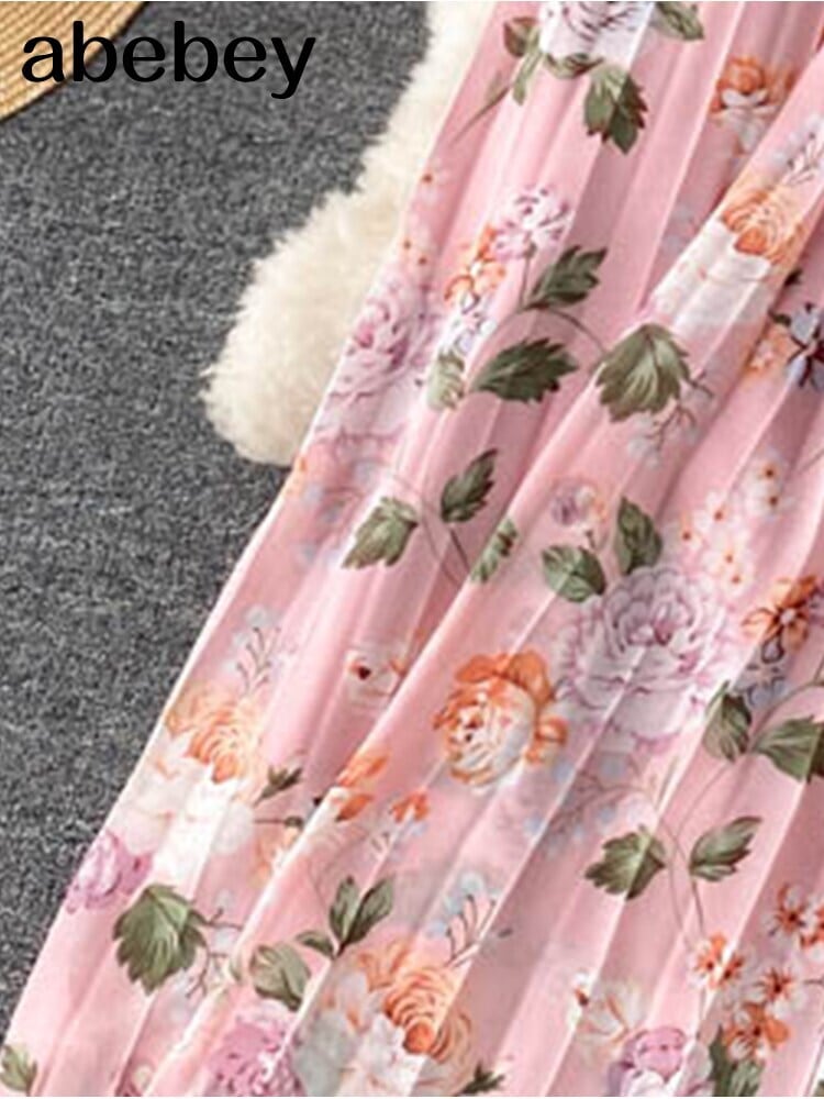 2022年女性フローラルドレープミディドレスボヘミアンOネックパフ長袖ウエスト包帯プリーツヴェスティドローブ ロング 花柄 Abe49714825258