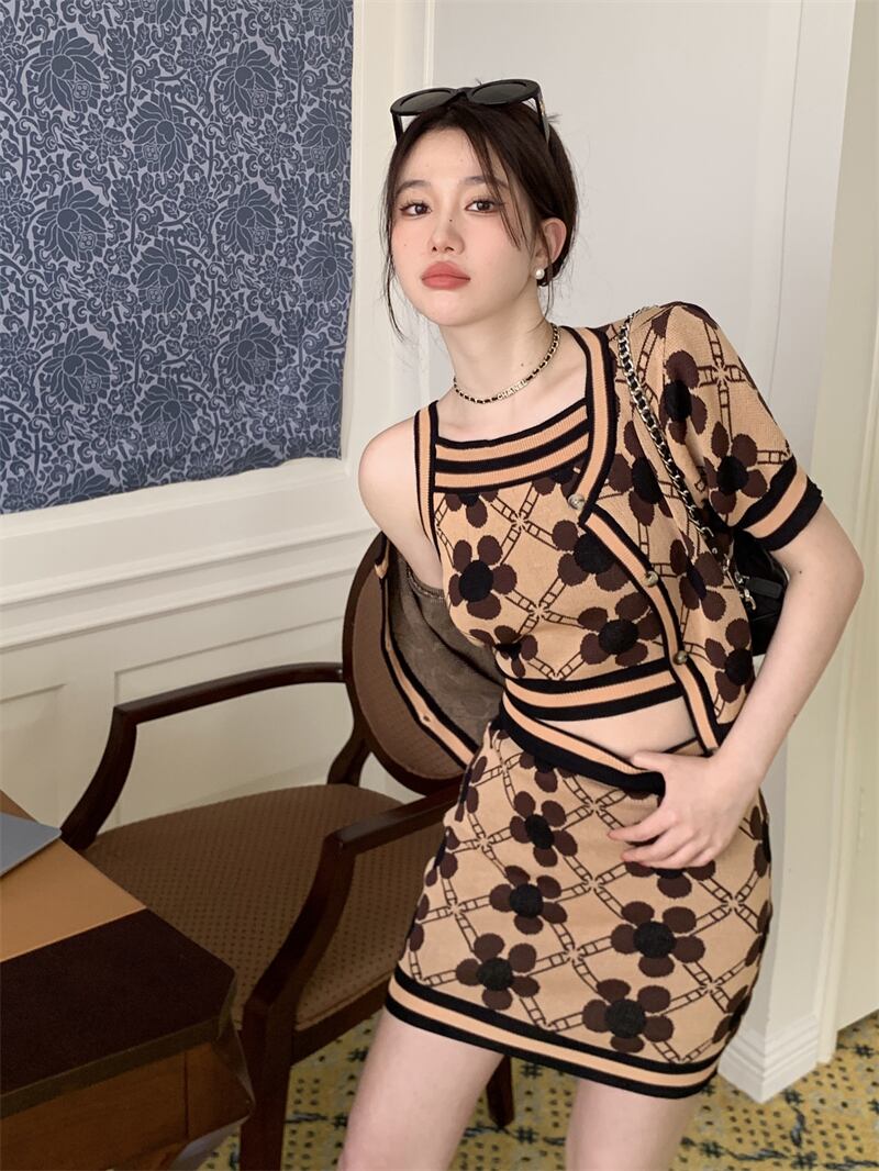 スウィートジャカードニット3点セット女性半袖Oネックカーディガンキャミソールミニスカートショートセーターセット衣装 ハーフスリーブ 大人ガーリー キュート カジュアル Rhc35438129868