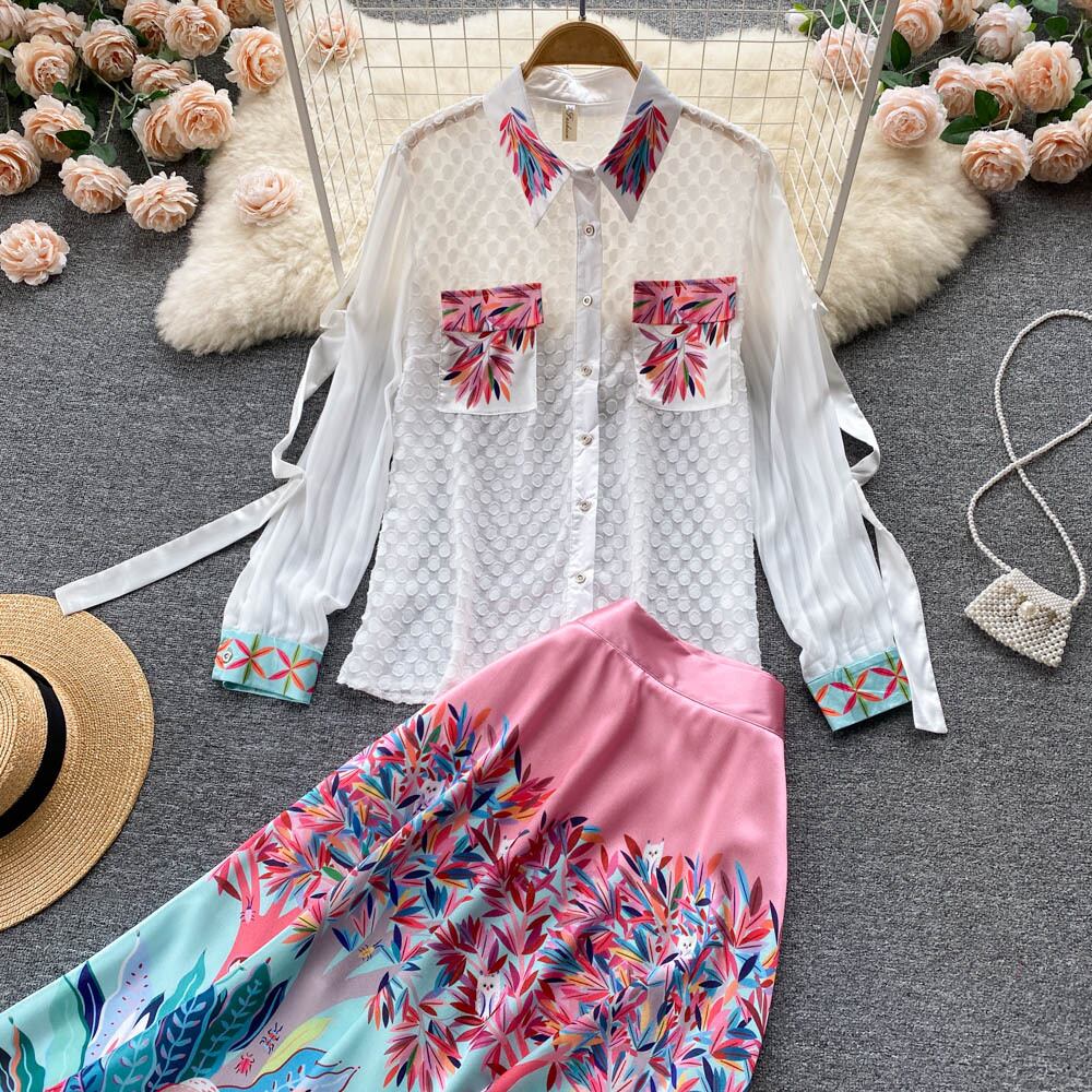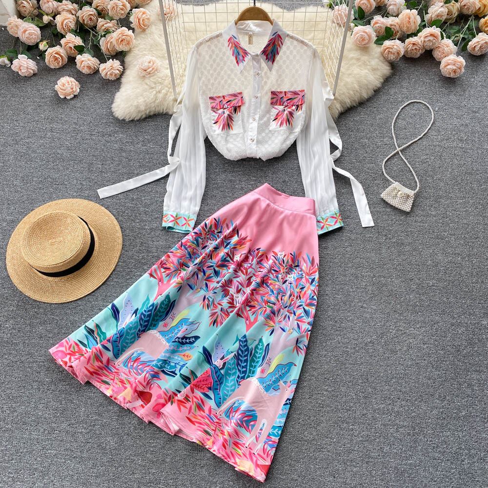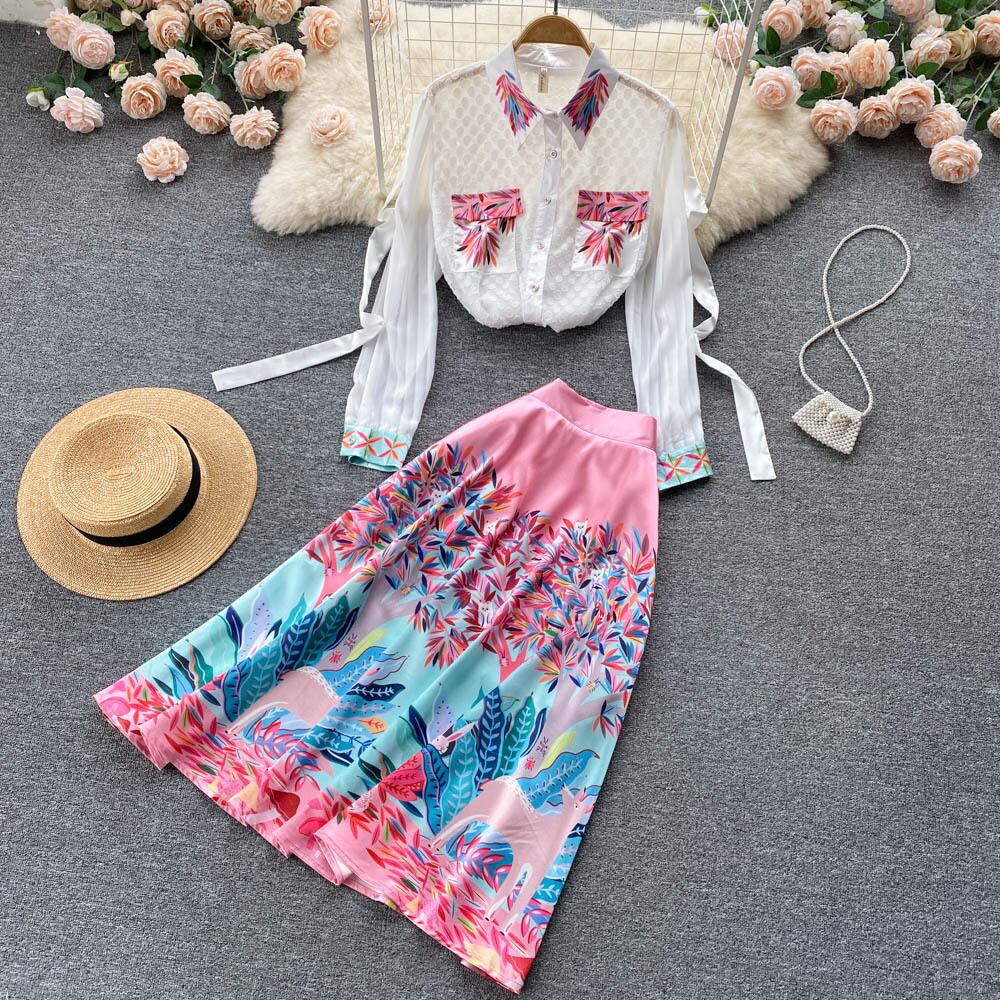 バケーションビーチウィメンズサマーセット2022ボタントップスターンダウンネックミディジッパースカートレトロプリントツーピースセット 夏物 Abe51082998508