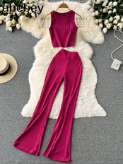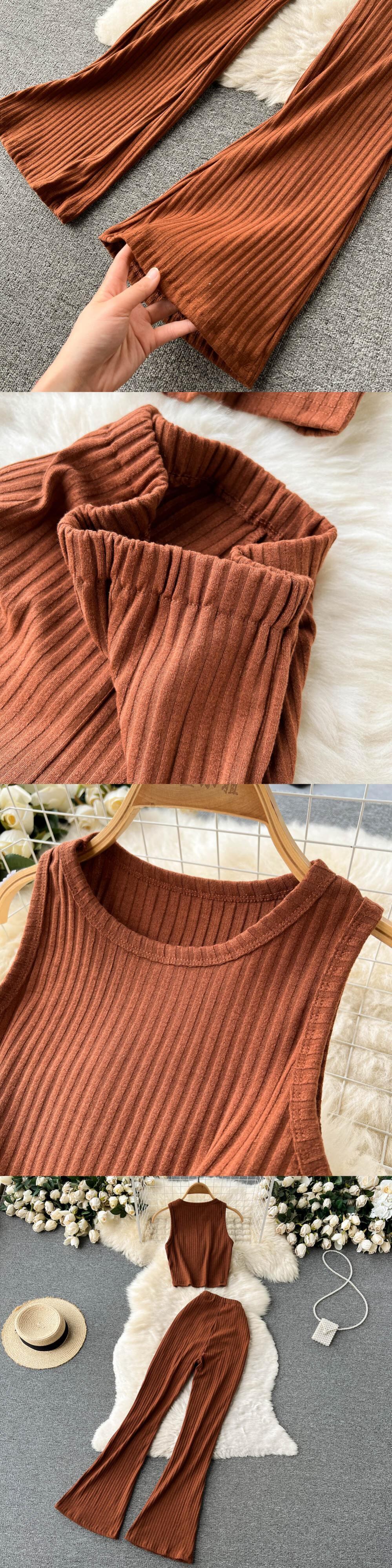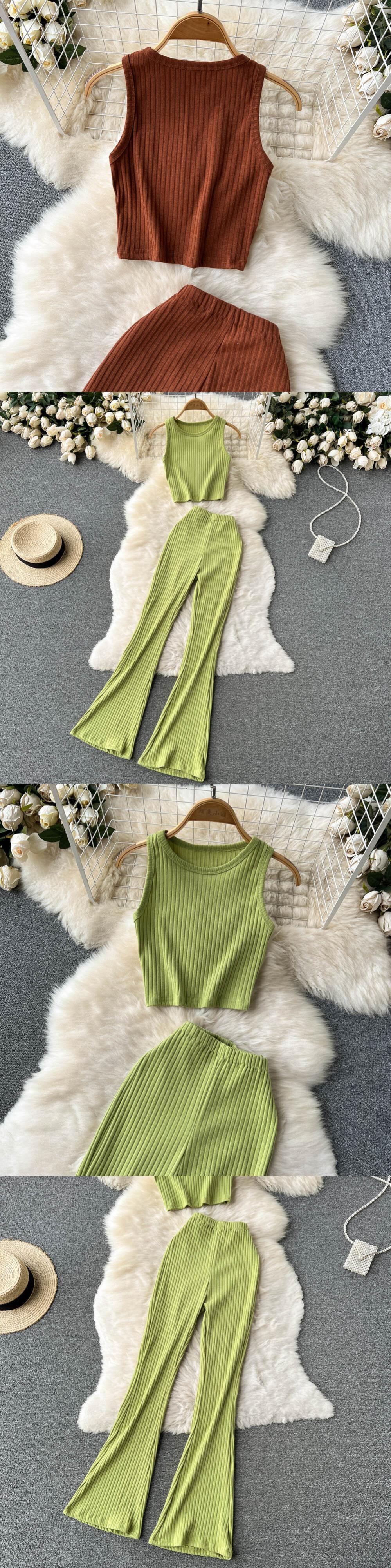 女性パンツセットボディコンスリムショートタンクトップ+ストライプワイドレッグロングパンツソリッドサマーツーピーススーツ 夏物 ワイドパンツ ソリッドカラー Abe38461101281