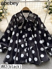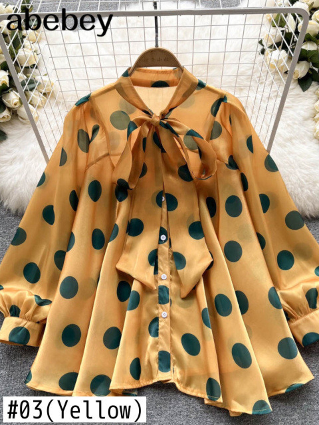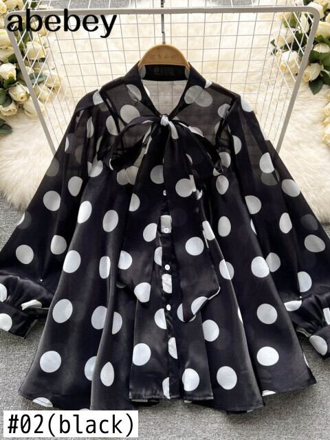 女性の白いシャツ2022チュニック夏の水玉ブラウスボタンルーズロングランタンスリーブラペルパーティートップス ホワイト サマー 夏物 Abe91678457011