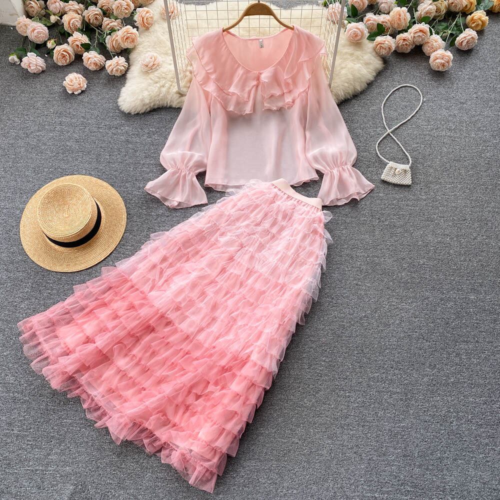 女性サマーフリルセットセクシーブラウストップス+ロングプリントロングスカートビーチスーツホリデーエラスティックウエストツーピースセット 伸縮 夏物 Abe67101143566
