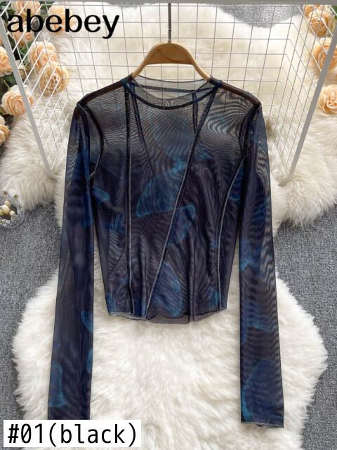 セクシーな2022年を参照してくださいトラフトップY2KヴィンテージグラフィックプリントグリーンメッシュシアーTシャツ長袖スリムフィットTシャツ女性の服 ロング ビンテージ Abe60245173181