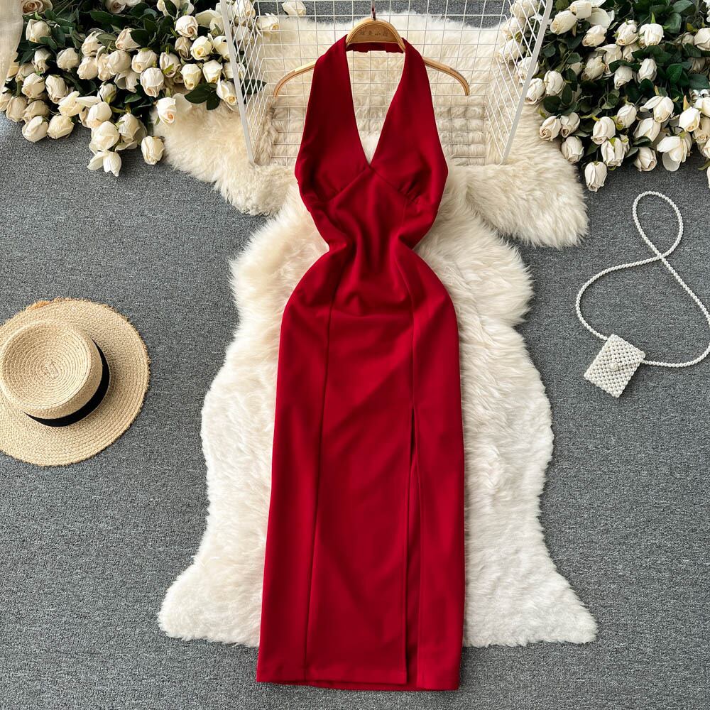 2022ホルターストラップベルベットセクシードレス夏の女性ストリートウェアスプリットサンドレスヴィンテージスリムミディロングドレスビーチローブ サマー 夏物 ビンテージ Abe14953082708