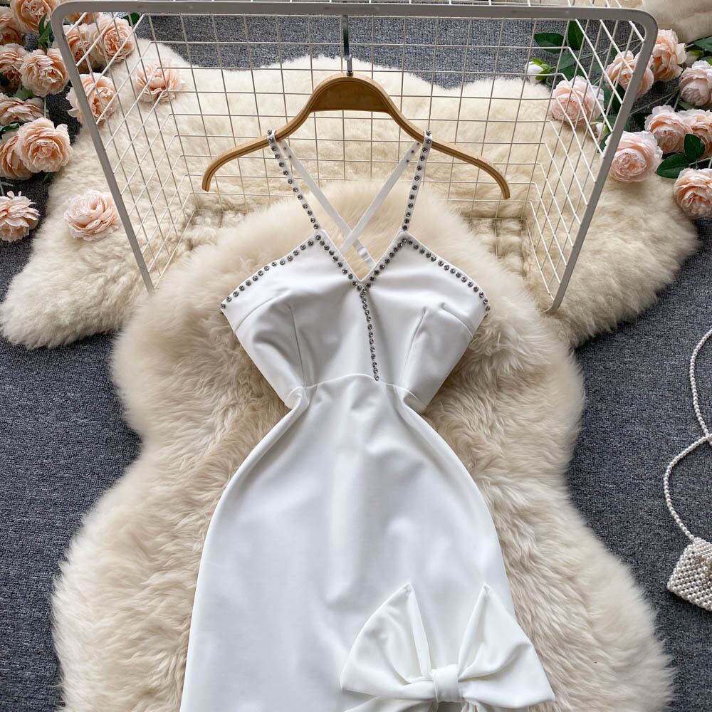 フレンチスタイルの夏の女性のドレス2022ボウVネックバケーションジェントルバックレスAラインミディドレスサンドレスローブ リボン サマー 夏物 Abe6359821323