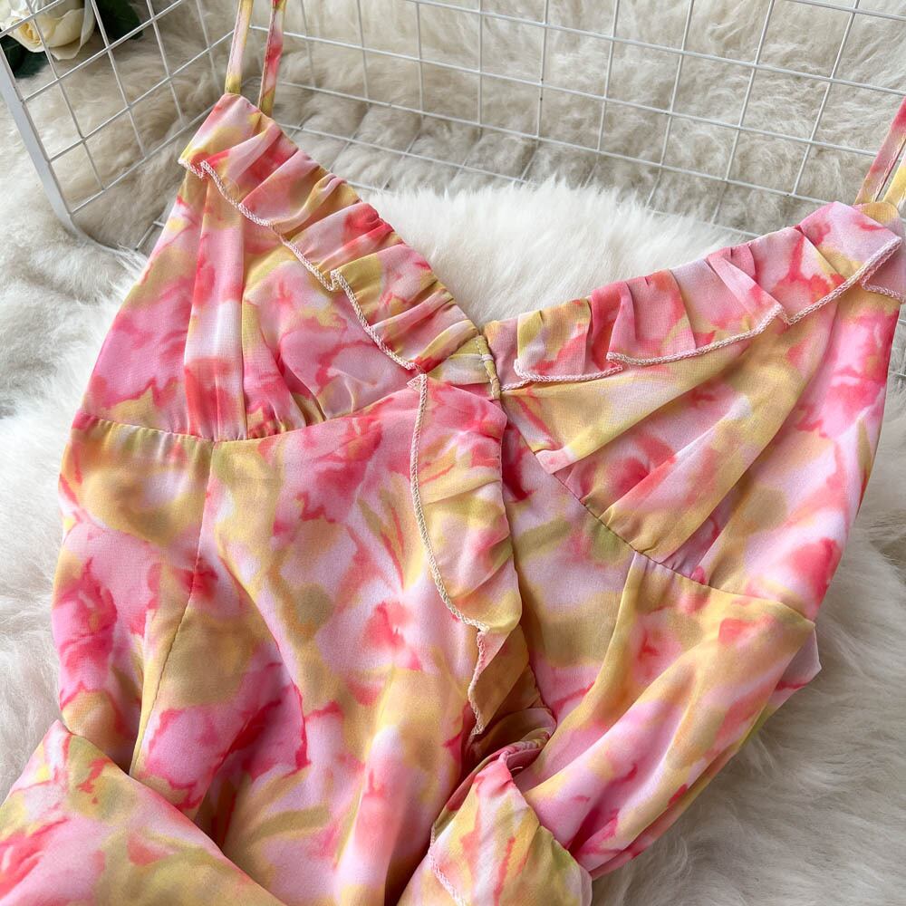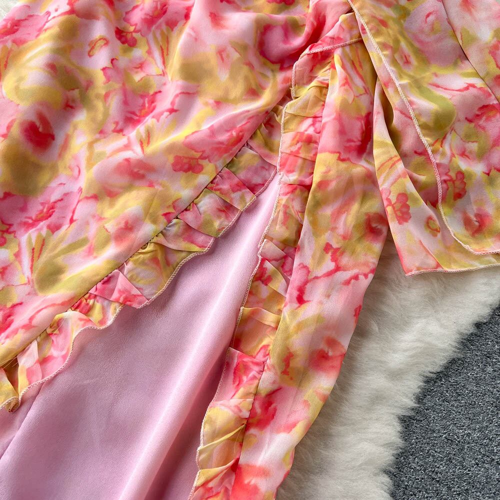 夏の女性シフォンストラップドレスノースリーブフリルスウィートプリントサンドレスビーチクラブセクシースプリットロングドレスサンドレスローブ 大人ガーリー キュート カジュアル サマー 夏物 Abe30643309318