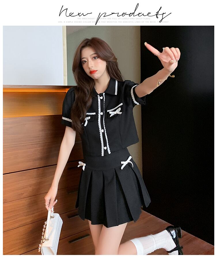 2022年夏半袖ボウシングルブレストショートシャツクロップトップ+ウエストAラインスカートツーピースセットレディース衣装 リボン ハーフスリーブ サマー 夏物 Rhc95756281110