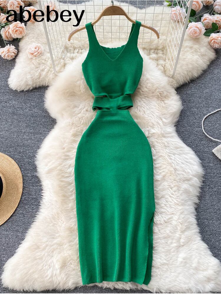 2022ニットグリーンミディセクシーボディコン女性ドレスタンクスパゲッティストラップサイドスプリットドレスシックなセータークラブパーティードレス Abe45132507169