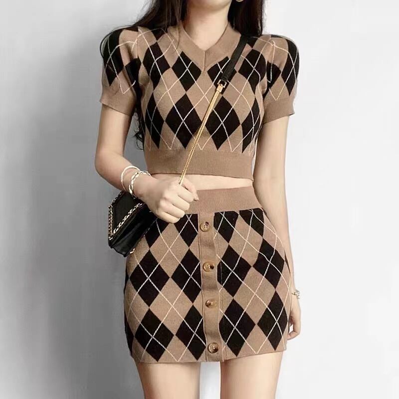 夏のチェック柄ツーピースセットレトロニットブラウンセットクロップトップとスカートかわいいスーツスリムストリートウェア 大人ガーリー スウィート キュート カジュアル サマー 夏物 Rhc79634796444