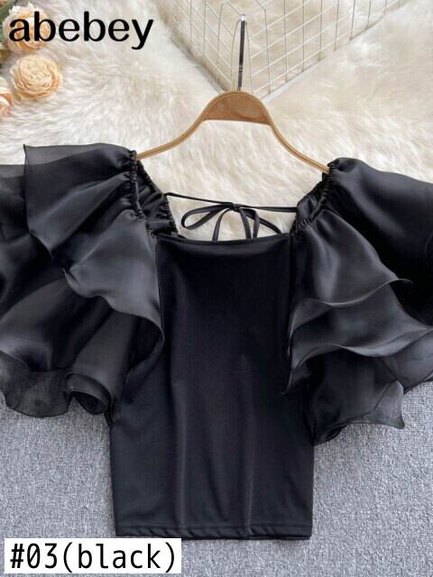 2022年夏のeseスタイルの女性のブラウスレトロな無地のラウンドネックフライングスリーブのシンプルさ サマー 夏物 Oネック ソリッドカラー Abe17908159397