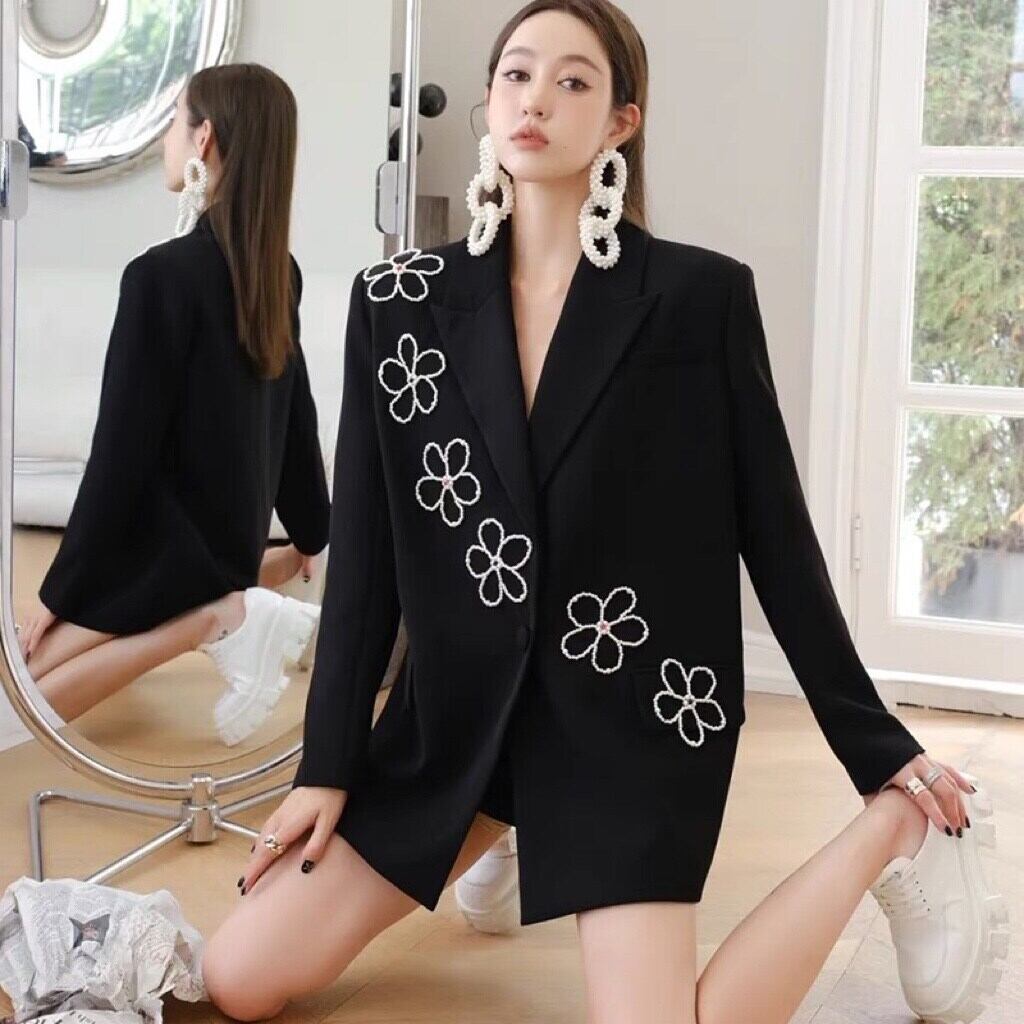 滑走路パールビーズシャイニーブレザーコート女性ノッチシングルボタンルーズガールズブラックアウタージャケットブレザーシック 真珠 Rhc39967012420