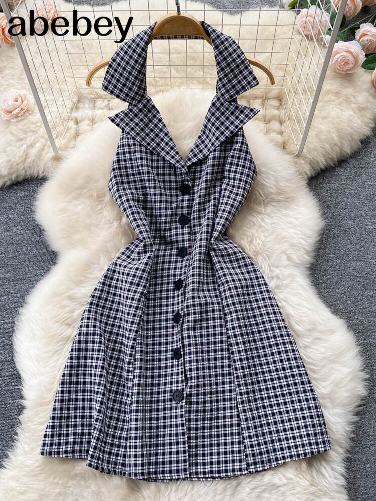 2022ホルターストラップセクシーなサンドレス格子縞の品質のタンクプリーツドレスサマースリングクラブパーティーミディドレス 夏物 Abe87316822274