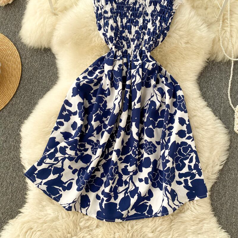 フレンチスクエアカラーバケーションビーチドレス女性2022年夏伸縮性ウエストシャーリングバックレスセクシースリムプリントミディドレス エラスティック サマー 夏物 スクウェア Abe91535359765