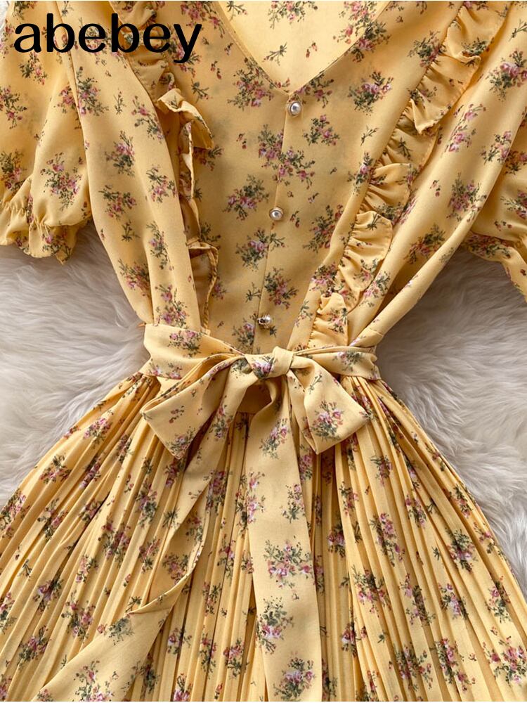 ボヘミアンスタイルの夏のロングドレス女性2022VネックプリーツスリムバケーションプリントFloarlAラインビーチドレス サマー 夏物 Abe13053987860