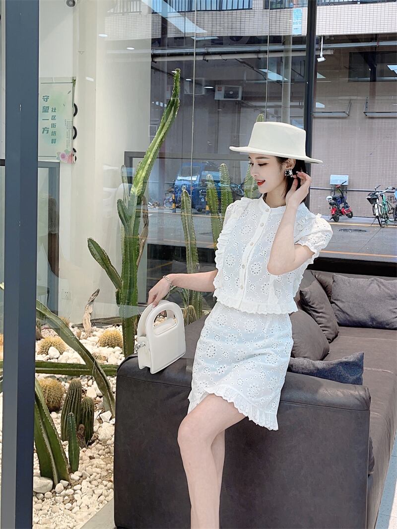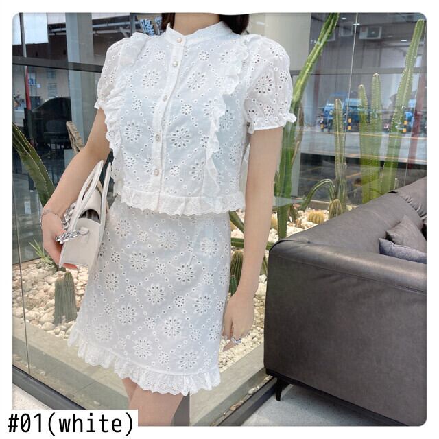 サマーレディ2ピーススウィートセットフリルホローアウトシングルブレストシャツ+シルムレーススカートマッチングセット女性 ラッフル 大人ガーリー キュート カジュアル 夏物 Rhc34940029414
