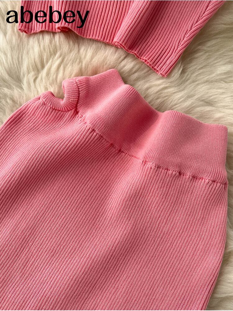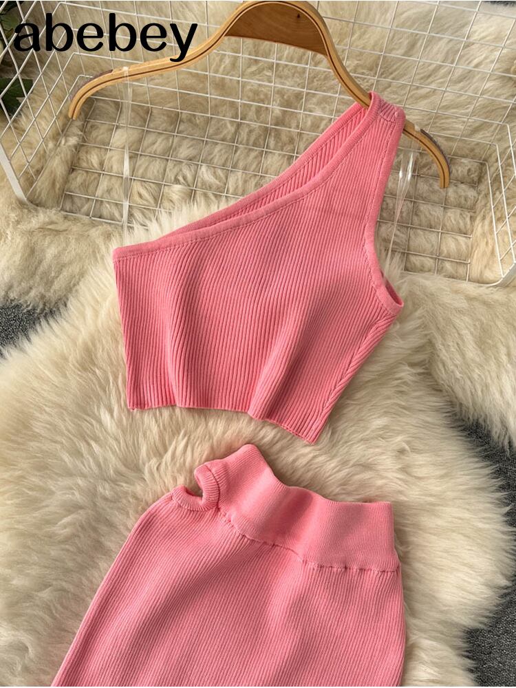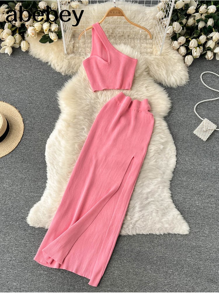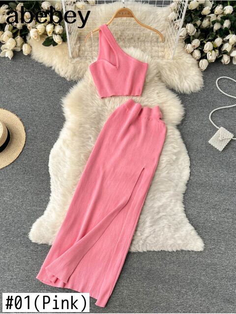 2022ピンクの夏の女性ソリッド2ピースワンショルダークロップトップタンクスリットミドルスカートセットボディコンセクシーなパーティー衣装 サマー 夏物 ソリッドカラー Abe72978599758