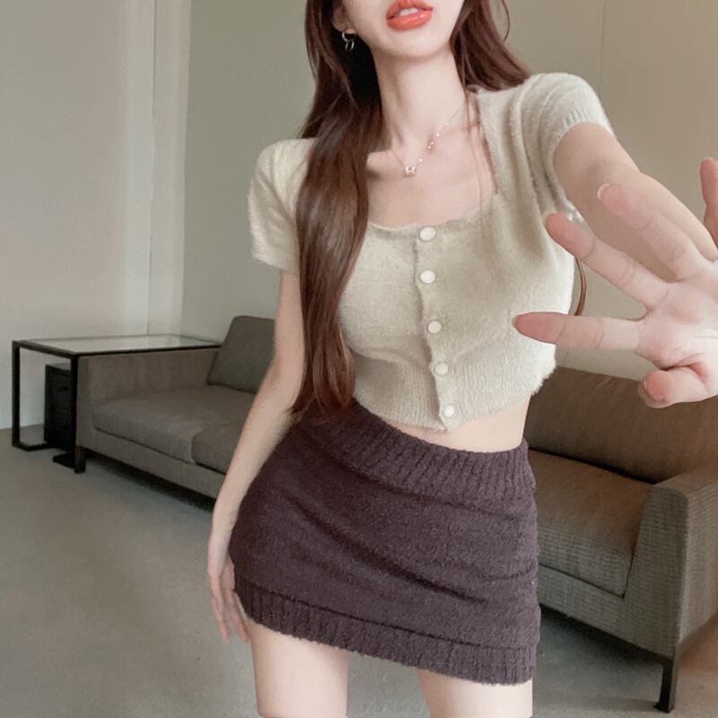 ニットサマーツーピースセットウーマンフェアリー半袖カーディガンシャツ+ウエスト伸縮性ミニスカート衣装ホット ショート ハーフスリーブ エラスティック 夏物 Rhc87587879541