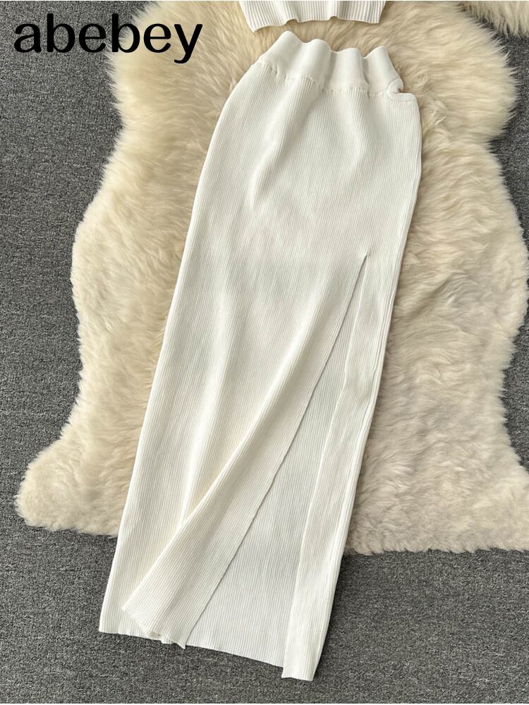 女性ツーピースセットニットピンクの衣装ワンショルダーカットアウトビスチェクロップトップ+ウエスト不規則なスプリットミドル丈スカート2022夏 サマー 夏物 Abe32805199084
