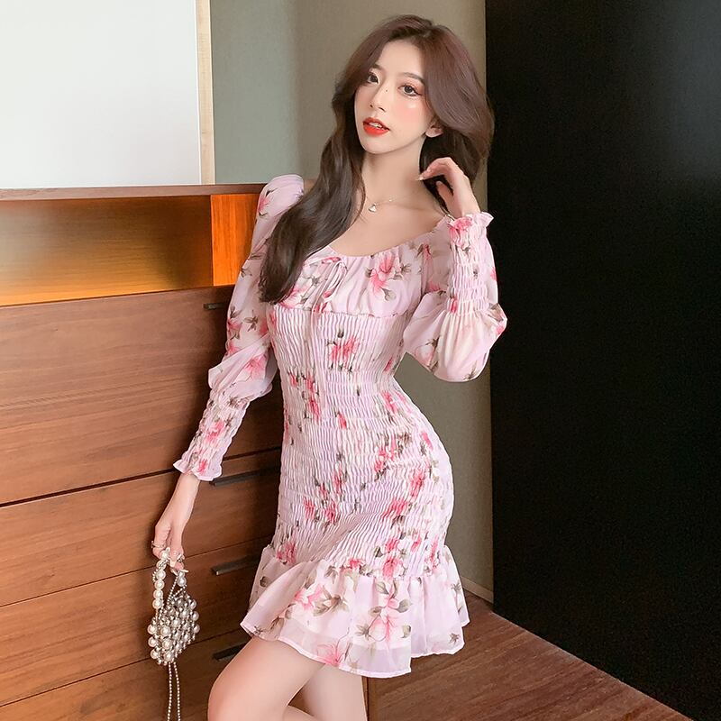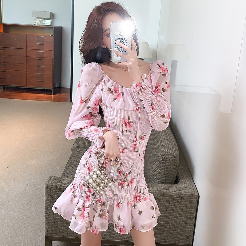 女性スクエアカラーフローラルプリント長袖スリムウエストドレス2022サマーオフショルダーウエストシフォンフリルドレス ロング ラッフル 夏物 花柄 スクウェア Rhc88619232365