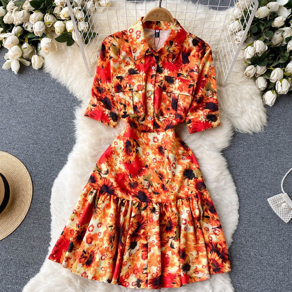 2022オフィスドレス女性プリント半袖ウエストAラインワークビジネスVestidosドレスミディ ショート ハーフスリーブ 会社 学校 通勤や通学にも Abe24790920096
