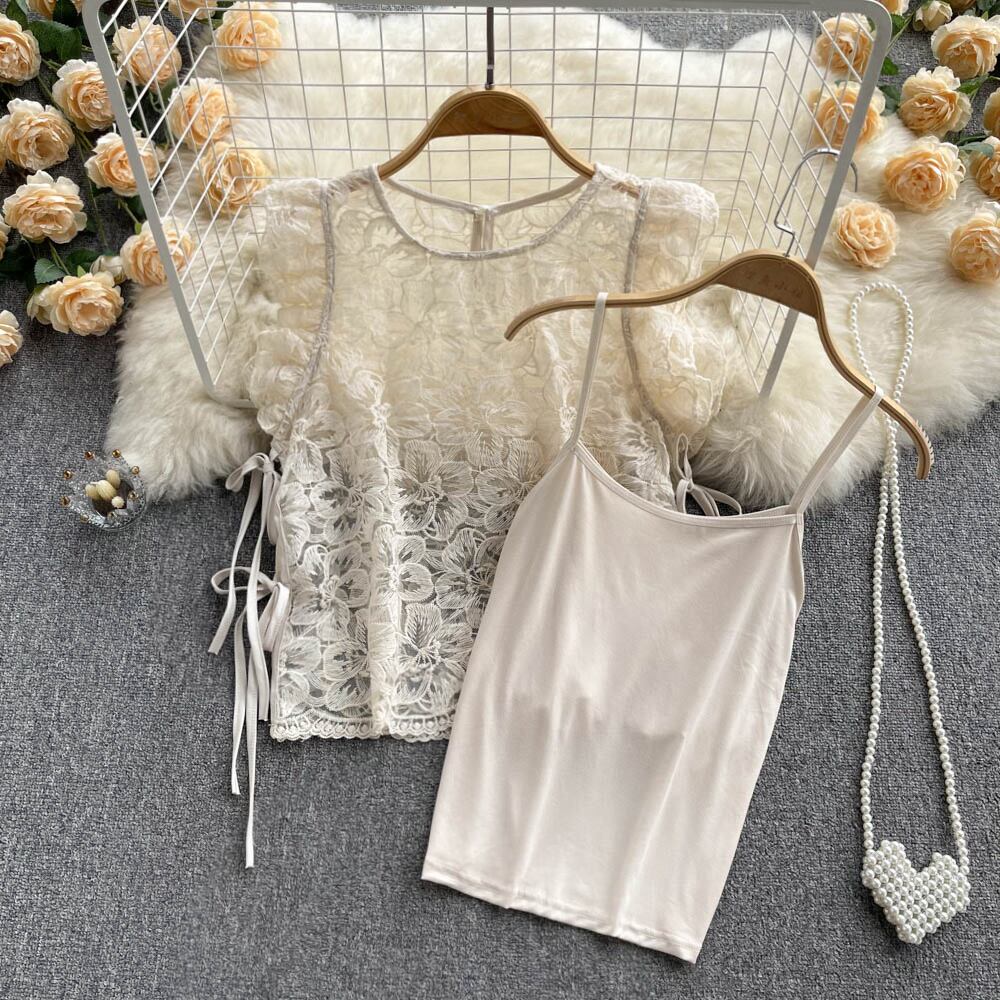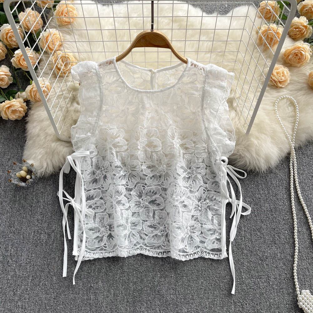 2022年夏のストリートウェアの女性の白いレースのブラウスシャツ半袖中空アウトヴィンテージかわいいフリルブラウスセクシーなトップス ショート ホワイト ハーフスリーブ 大人ガーリー スウィート キュート カジュアル サマー 夏物 ビンテージ Abe22465054966