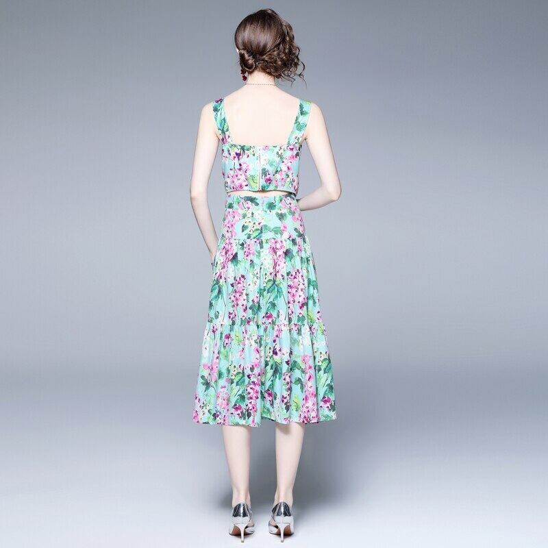女性プリント夏2022年ホリデー2ピースセットスパゲッティストラップショートブラウス&ビッグスイングミディスカートスーツスカート サマー 夏物 Rhc77676652172